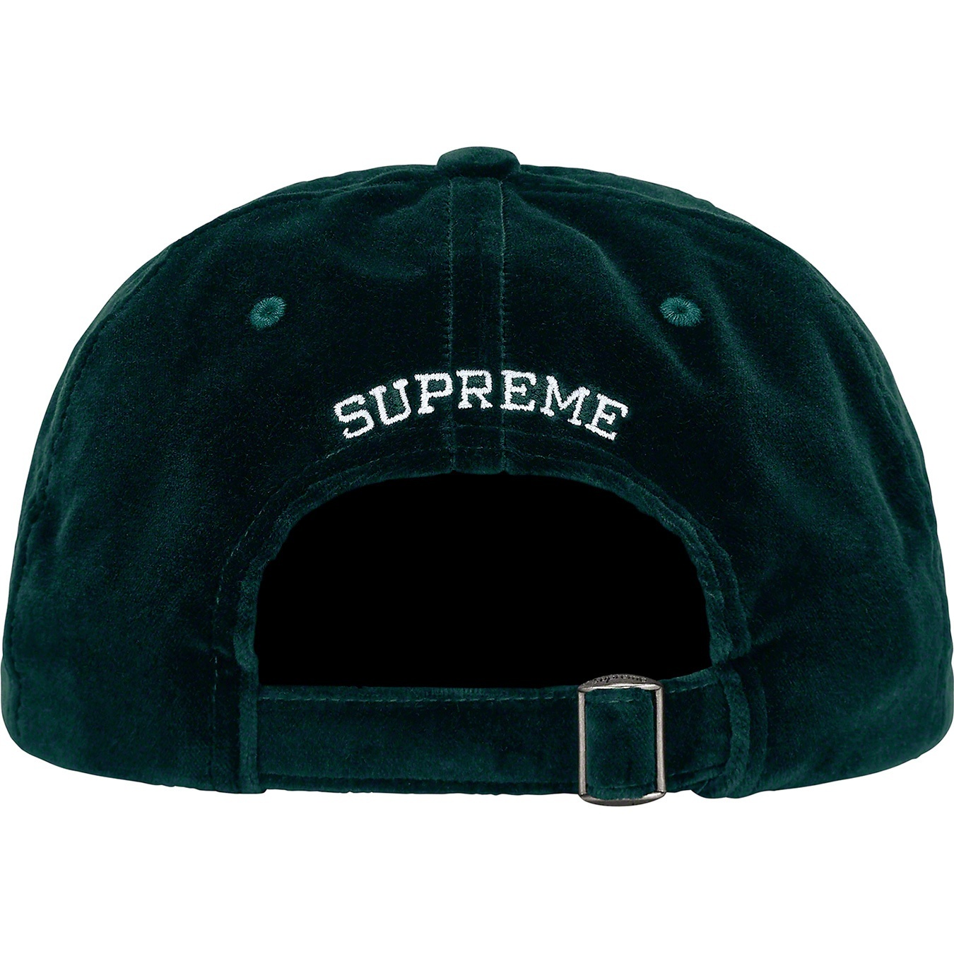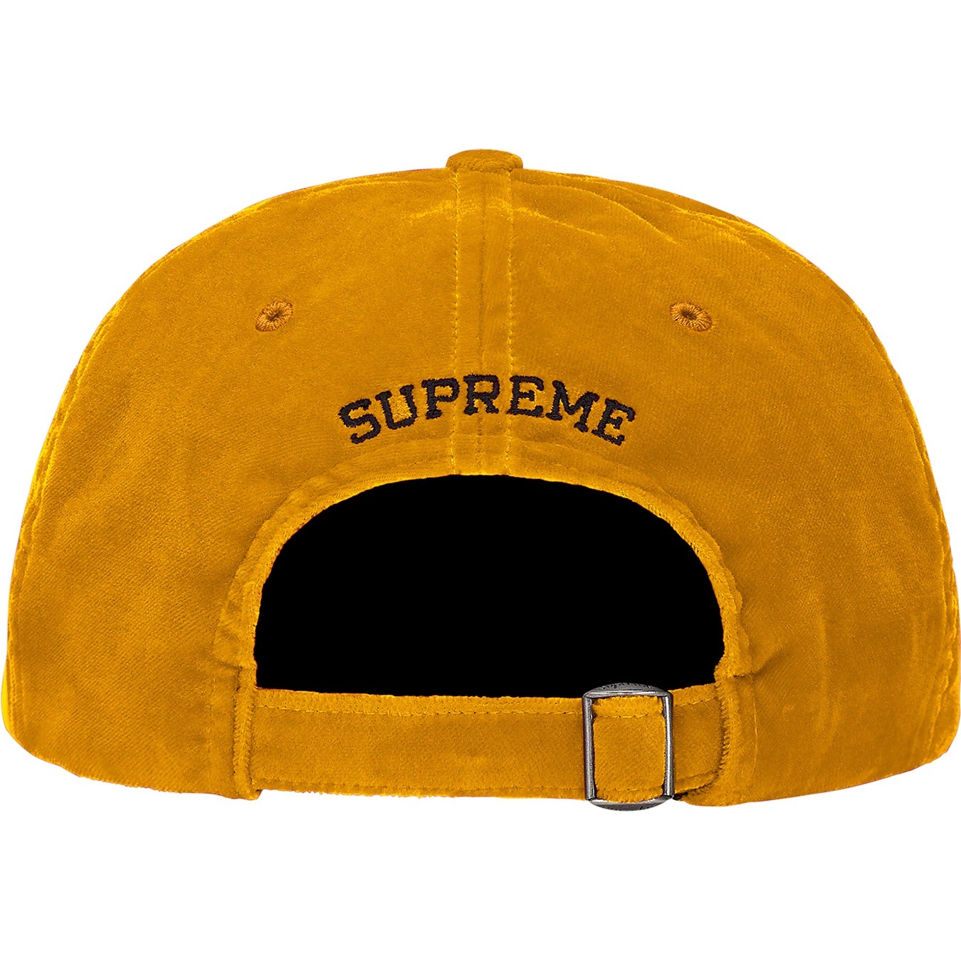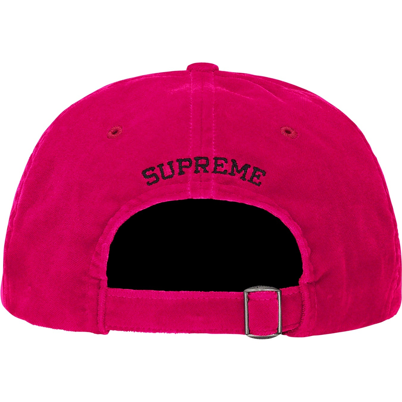 All cotton velvet 6-Panel hat with self strap closure. Embroidered logos on front and back.