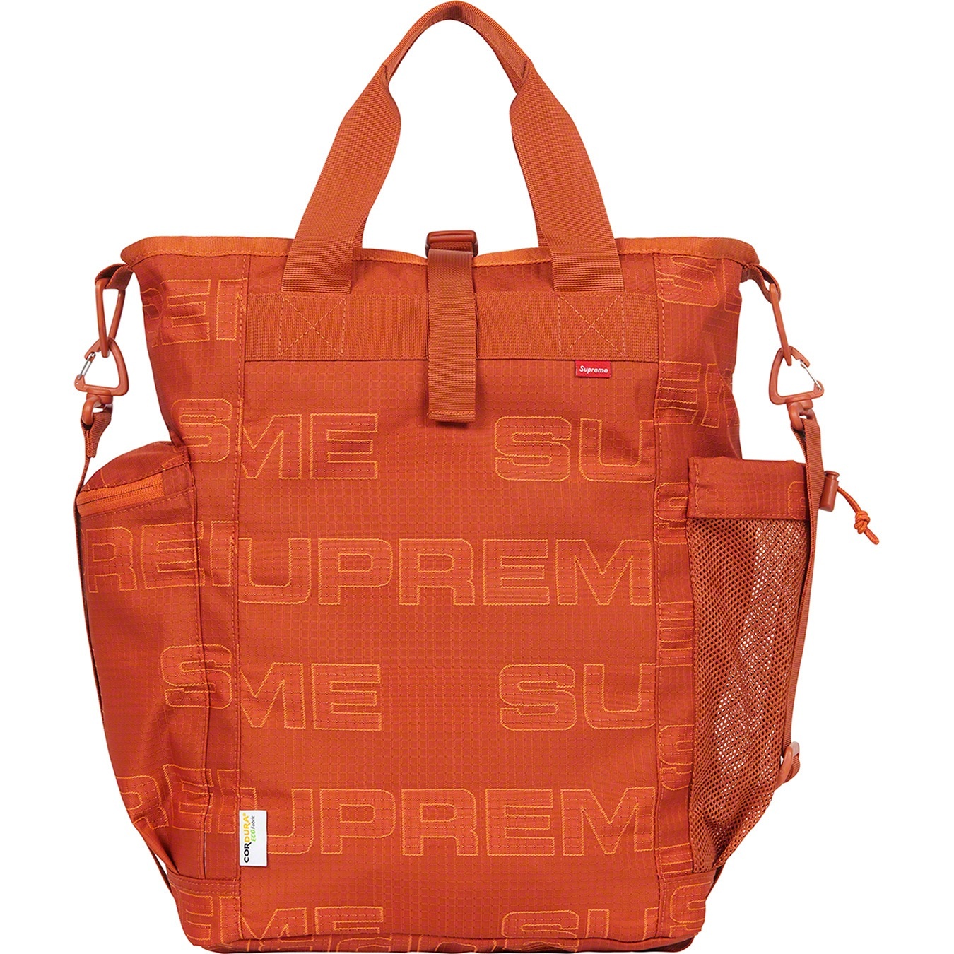 Water resistant Cordura® recycled nylon ripstop with jacquard logo pattern and embossed logo lining. Main compartment with zip mesh pocket, buckle and cinch top closure. Additional front zip mesh pocket. Zip pocket and mesh pocket with interior elasti...
