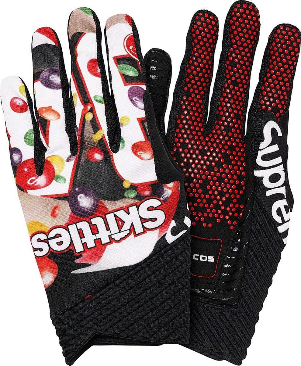 Custom fit breathable poly cycling gloves with printed graphic at top. Velcro closure at neoprene cuffs with vents at fingers and silicone palms. Printed logos at thumbs. Made exclusively for Supreme.
