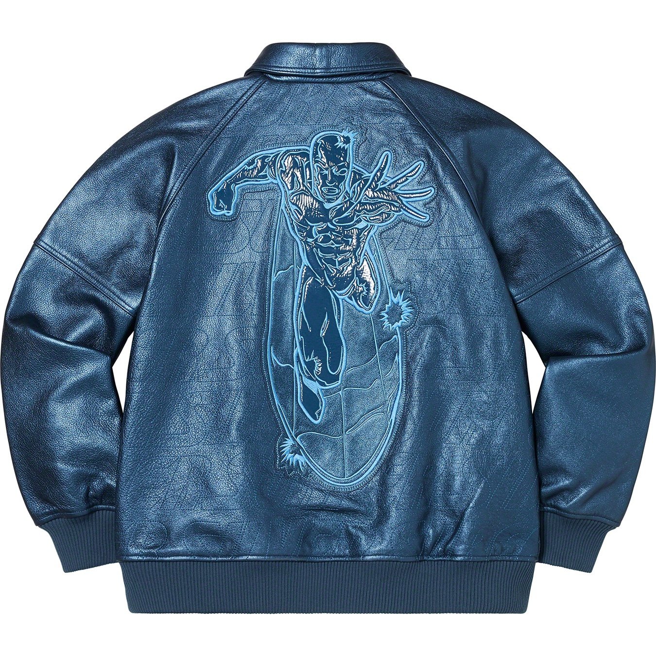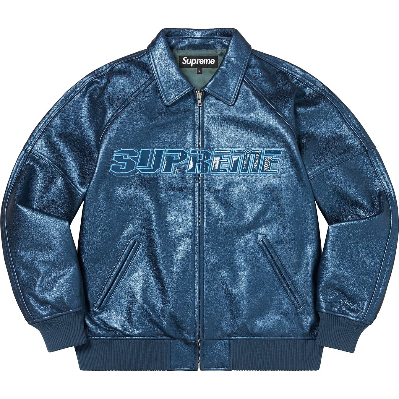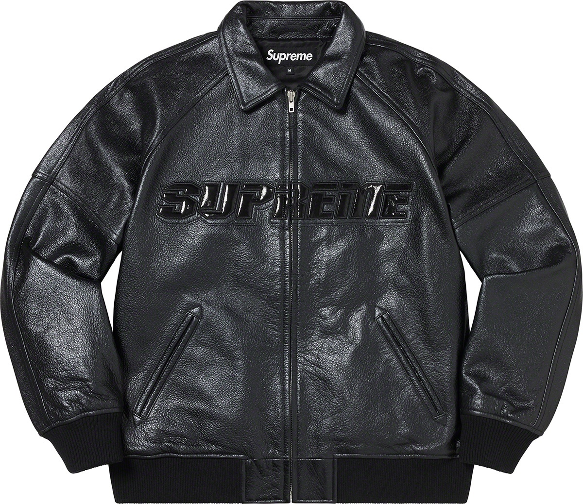 Pearlized pebbled cowhide leather with Bemberg twill lining and full zip closure. Double welt hand pockets at lower front and interior chest pocket. Knit rib cuffs and hem. Patent leather logo appliqué at chest. Patent leather graphic appliqué and emb...