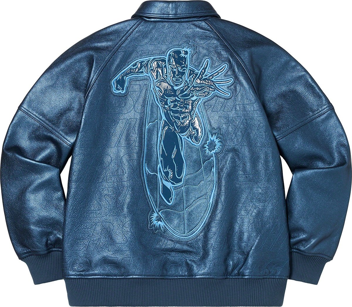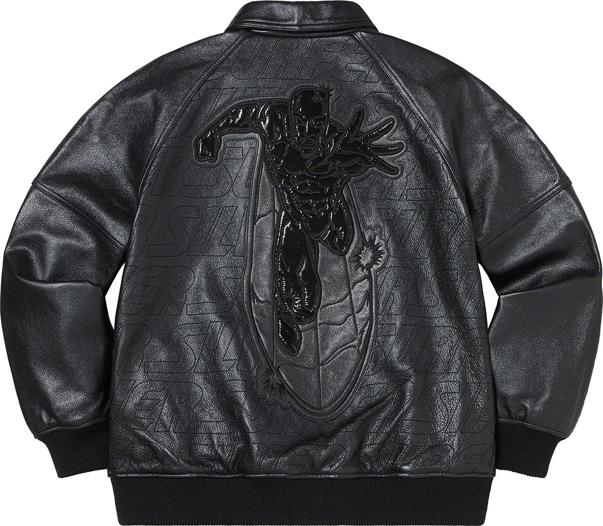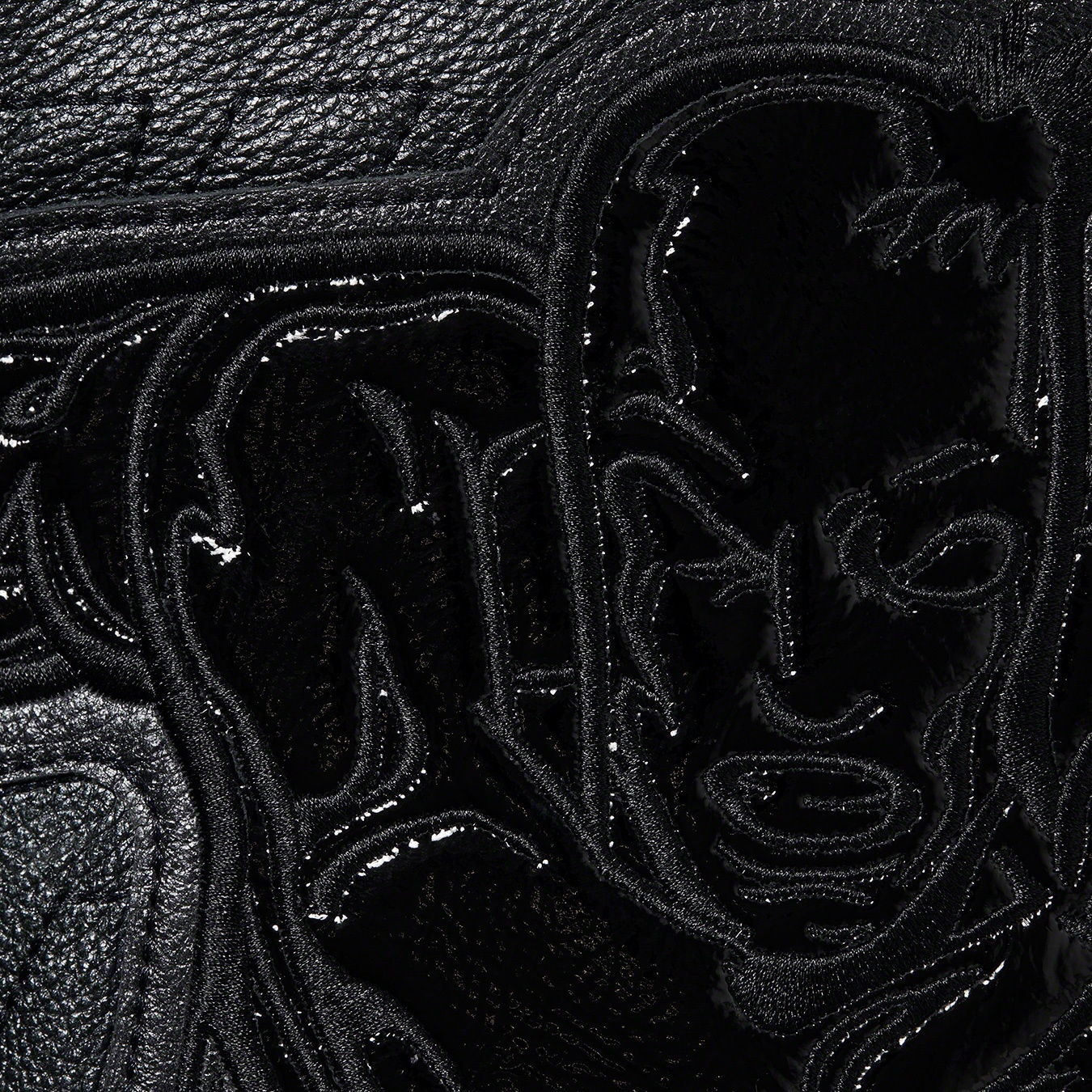 Pearlized pebbled cowhide leather with Bemberg twill lining and full zip closure. Double welt hand pockets at lower front and interior chest pocket. Knit rib cuffs and hem. Patent leather logo appliqué at chest. Patent leather graphic appliqué and emb...
