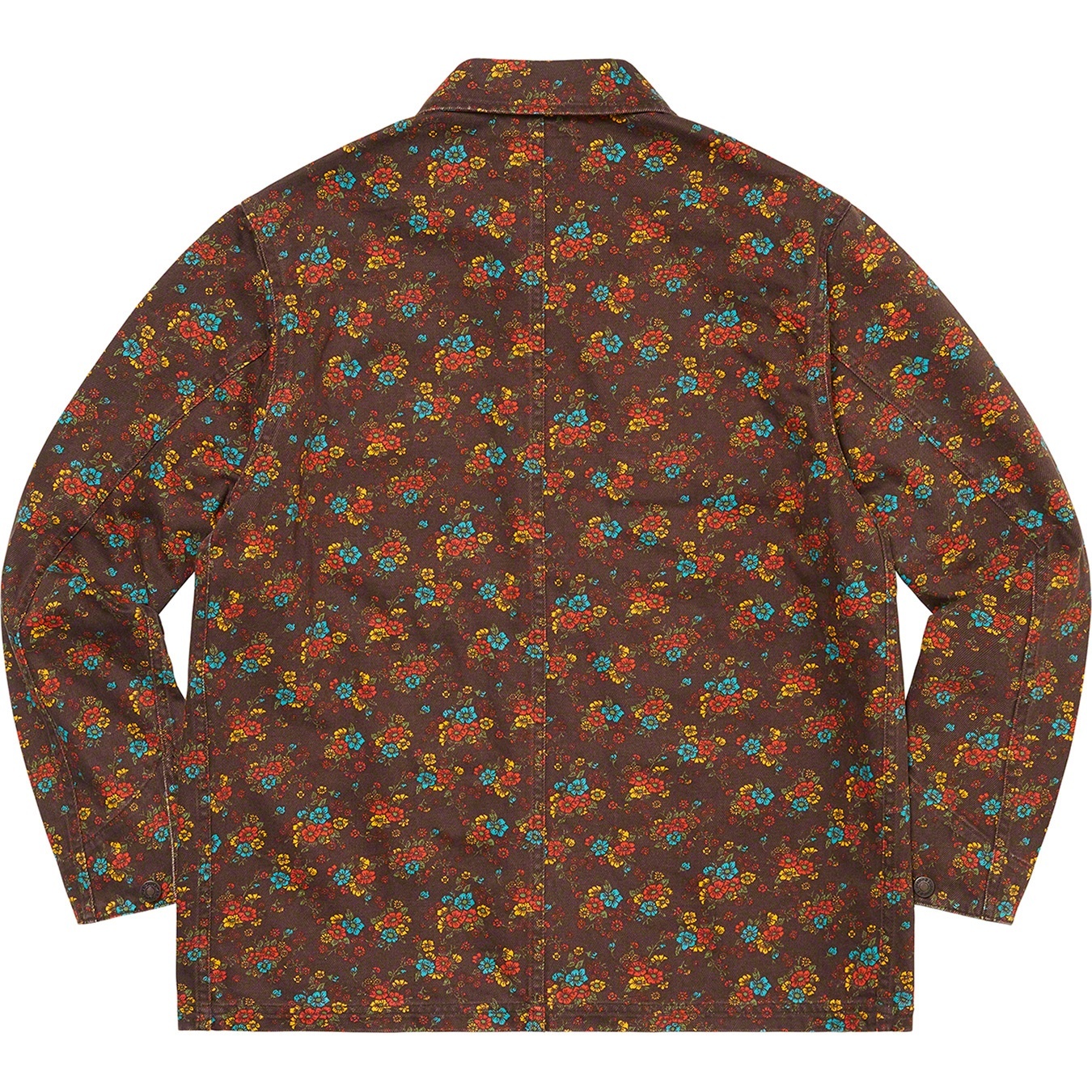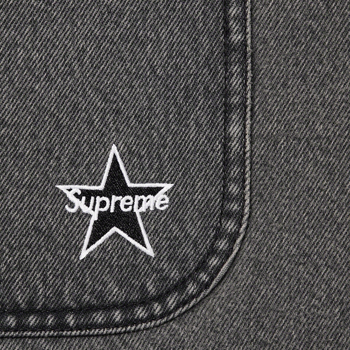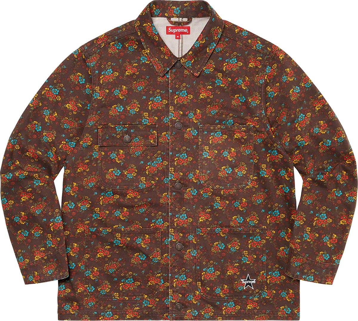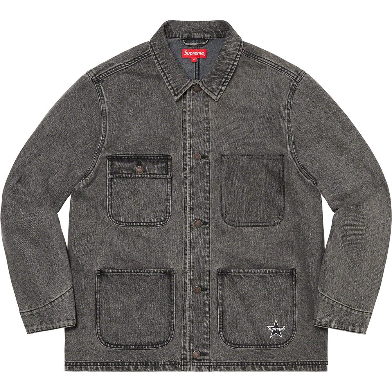 All cotton 13 oz. denim with button front closure. Patch pockets at lower front and chest with button flap closure. Tab adjusters at cuffs and embroidered logo on lower left pocket.