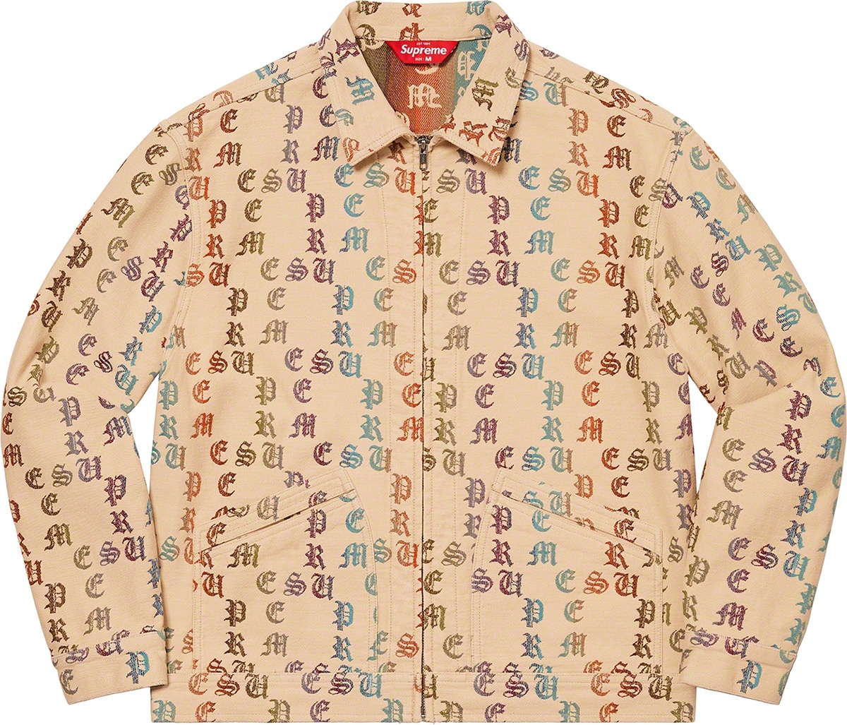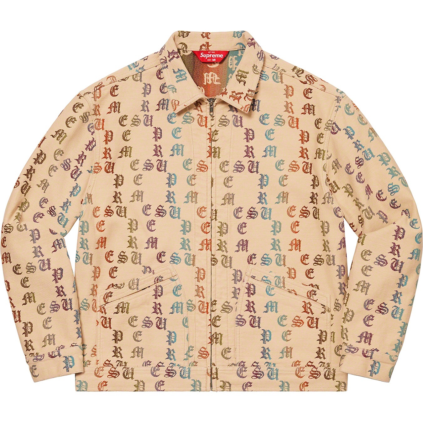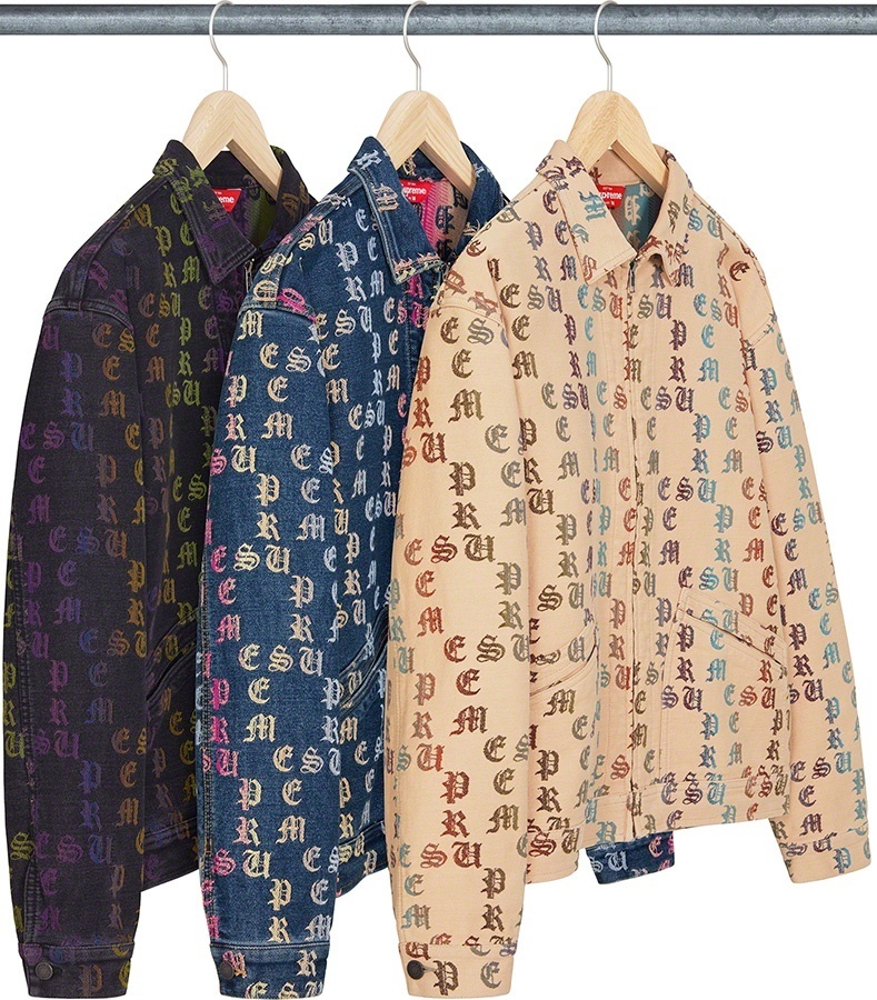 All cotton denim with jacquard logo pattern. Full zip closure with double welt patch pockets at lower front. Tab adjusters at cuffs and back hem.