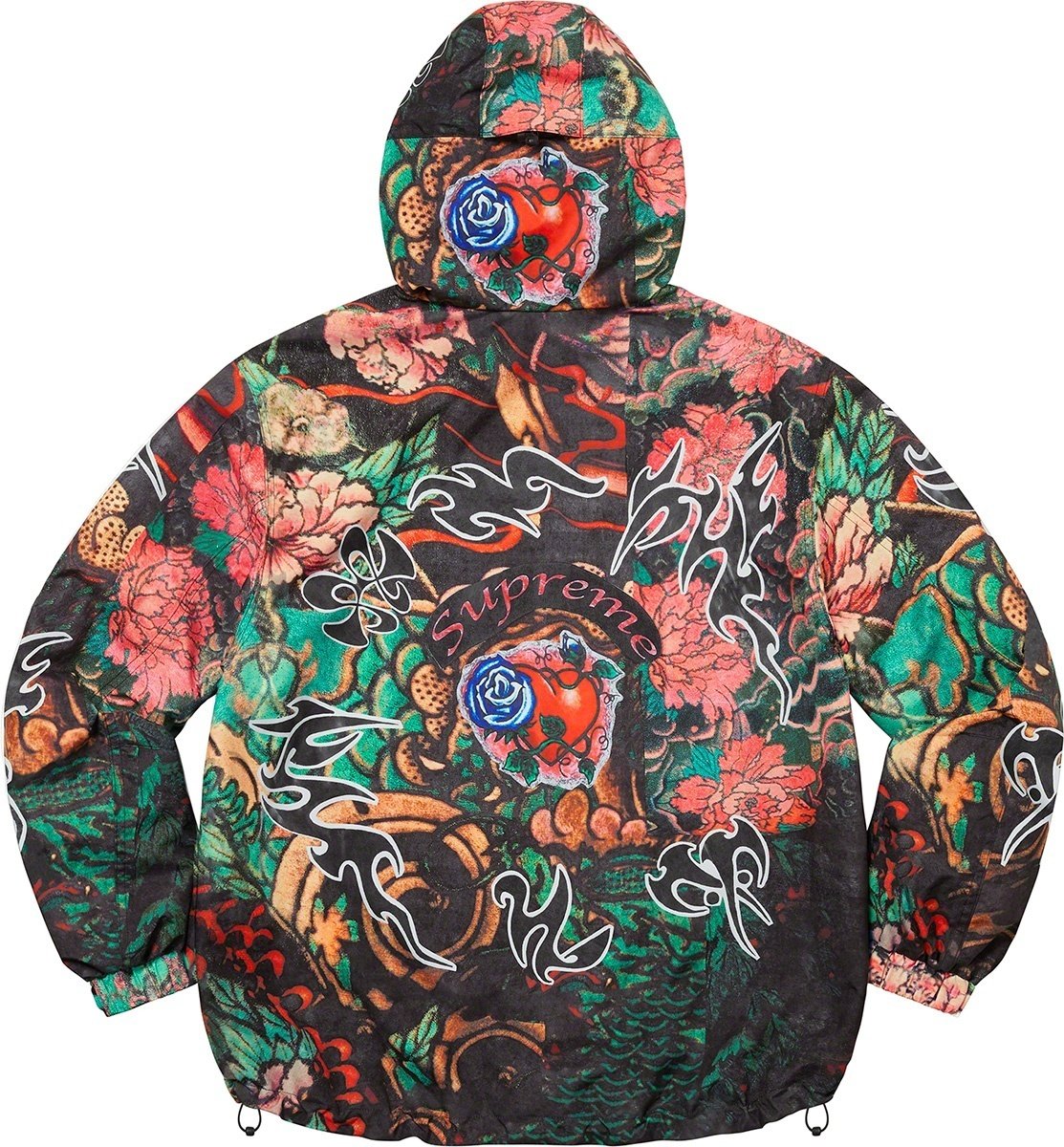 Waterproof, breathable GORE-TEX poly with printed graphic and embossed logo lining. Full zip closure with hidden velcro placket. Welt zip hand pockets at lower front and zip chest pocket. Interior elastic shockcord at fixed hood and hem. Velcro tab ad...