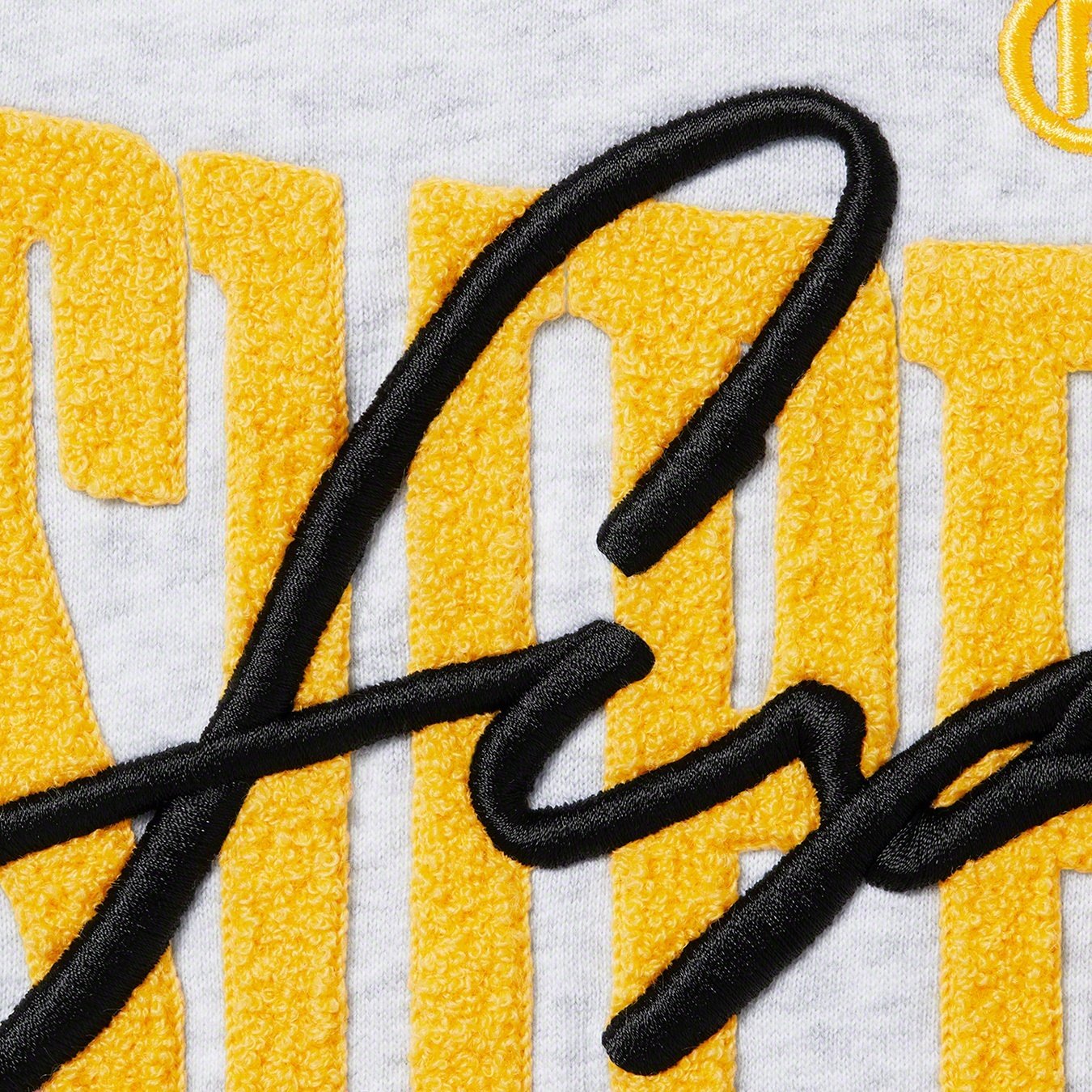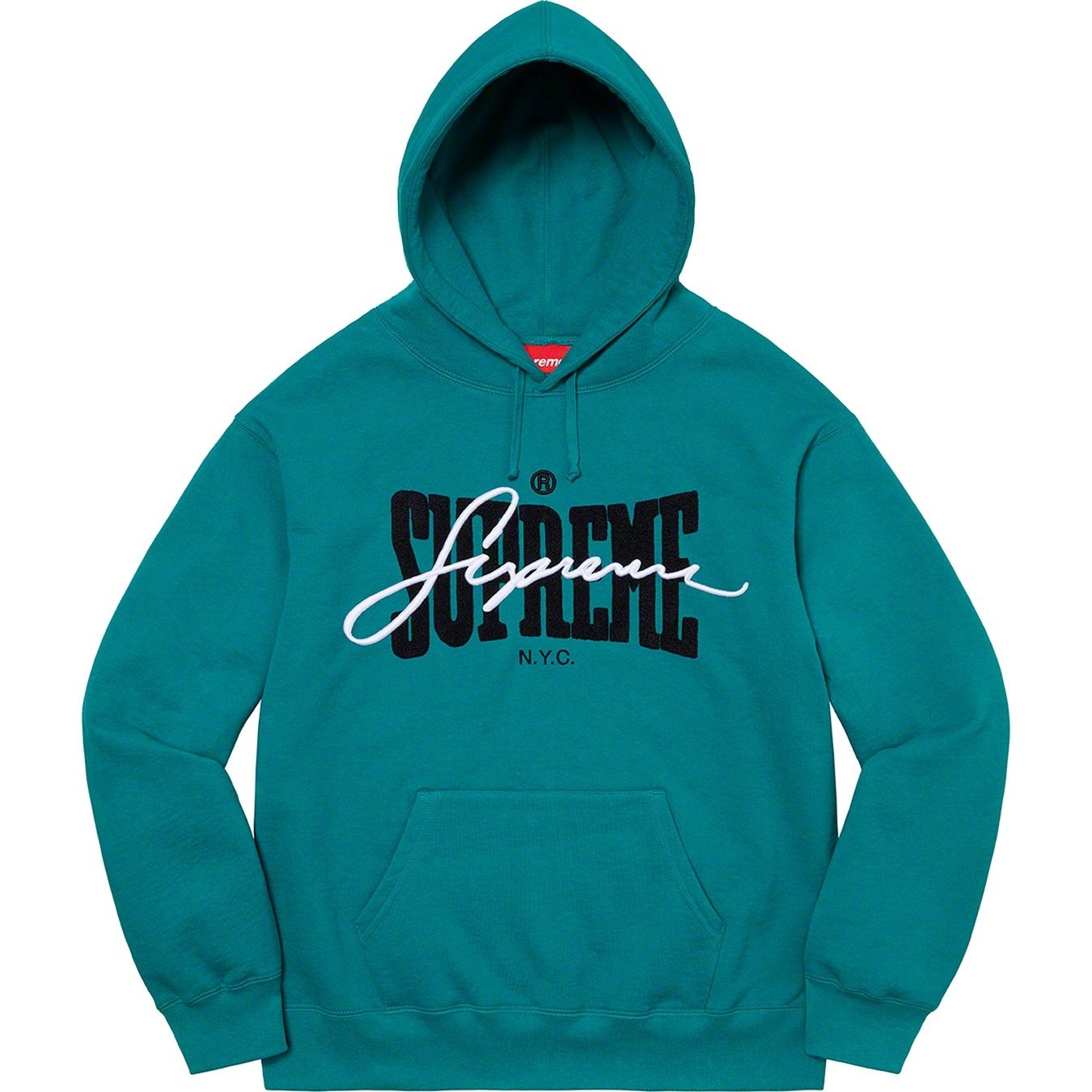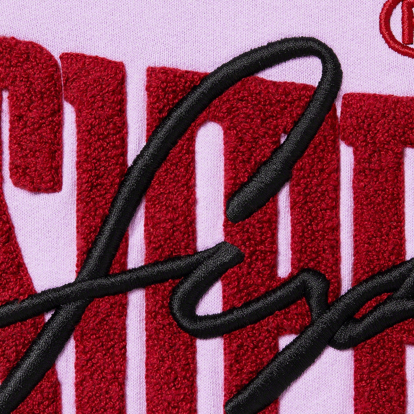 Brushed-back fleece with pouch pocket. Chenille and embroidered logos on chest.