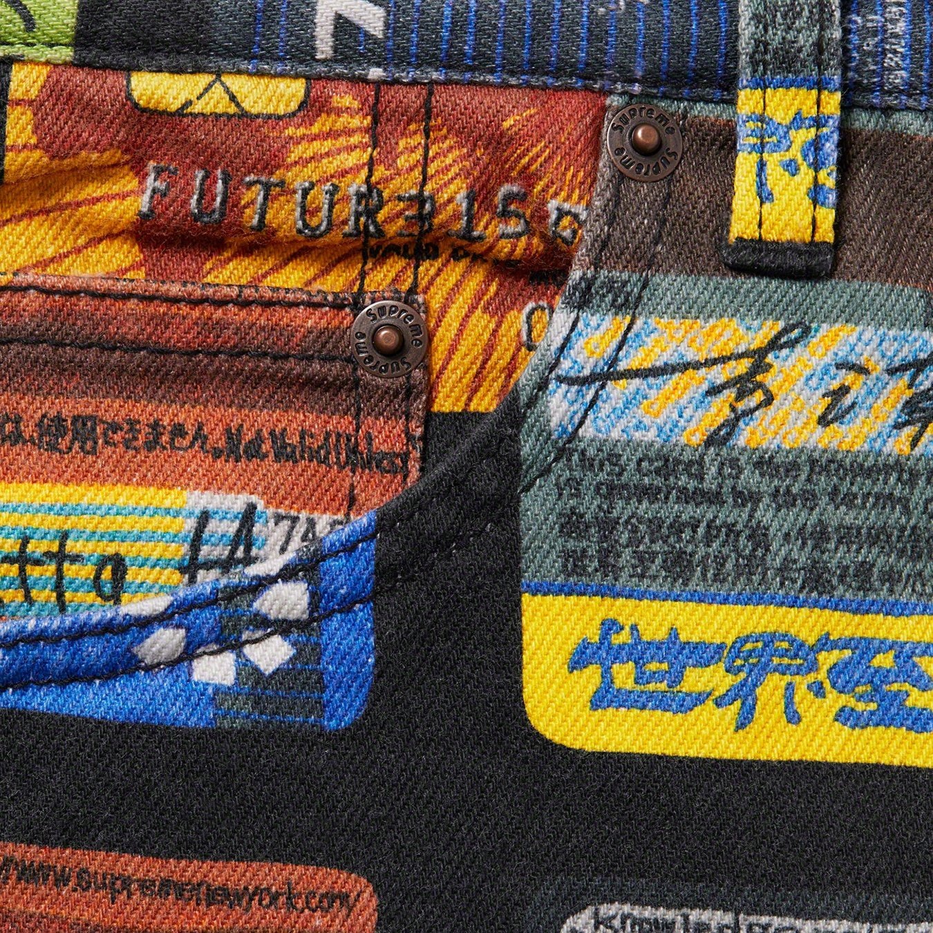 All cotton 13 oz. denim with printed pattern and enzyme wash. Classic 5-pocket style with button fly, single coin pocket, copper oxide rivets and leather logo patch on back. Original artwork by Lee Kan Kyo.