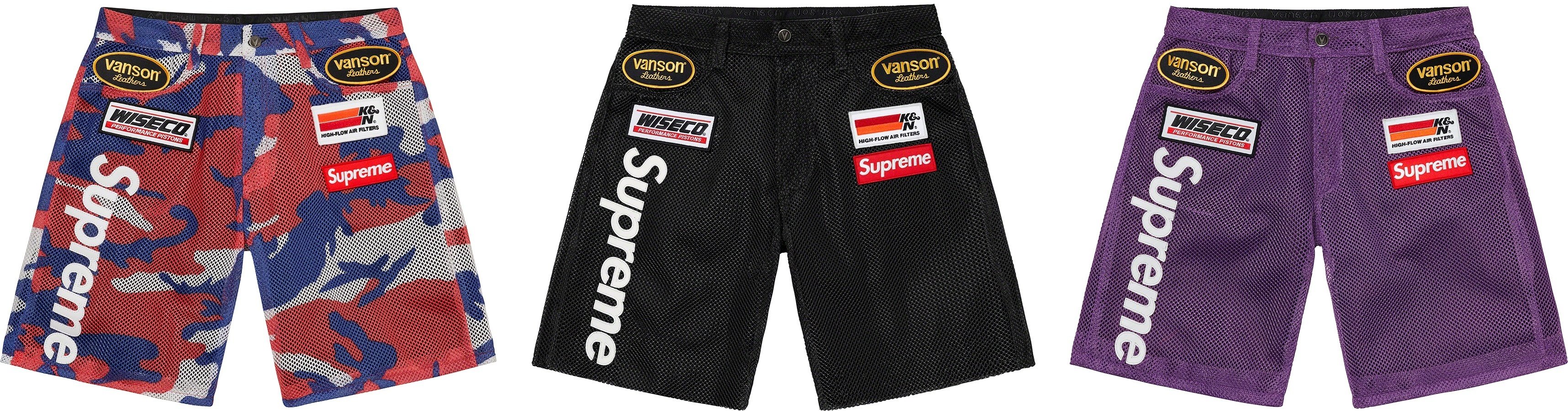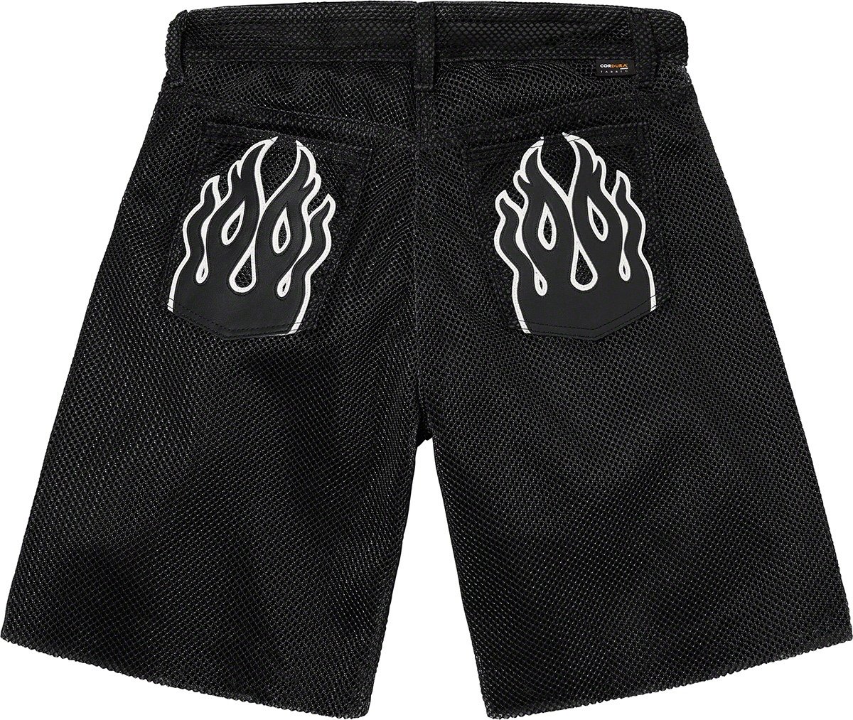Cordura® mesh with jersey mesh lining. Classic 5-Pocket style with zip fly. Leather logo appliqué at right leg with leather graphic appliqué at back pockets. Embroidered logo patches at front pockets. Made exclusively for Supreme.