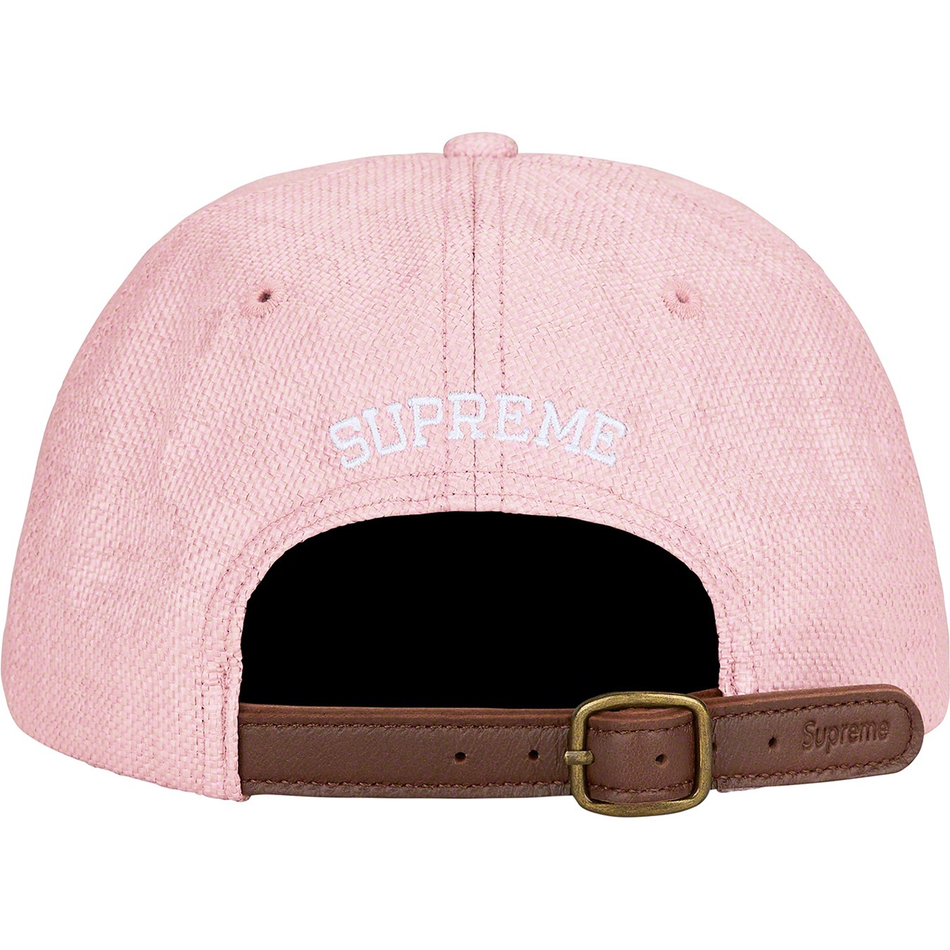Woven raffia 6-Panel hat with custom debossed leather strap closure. Embroidered logos on front and back.