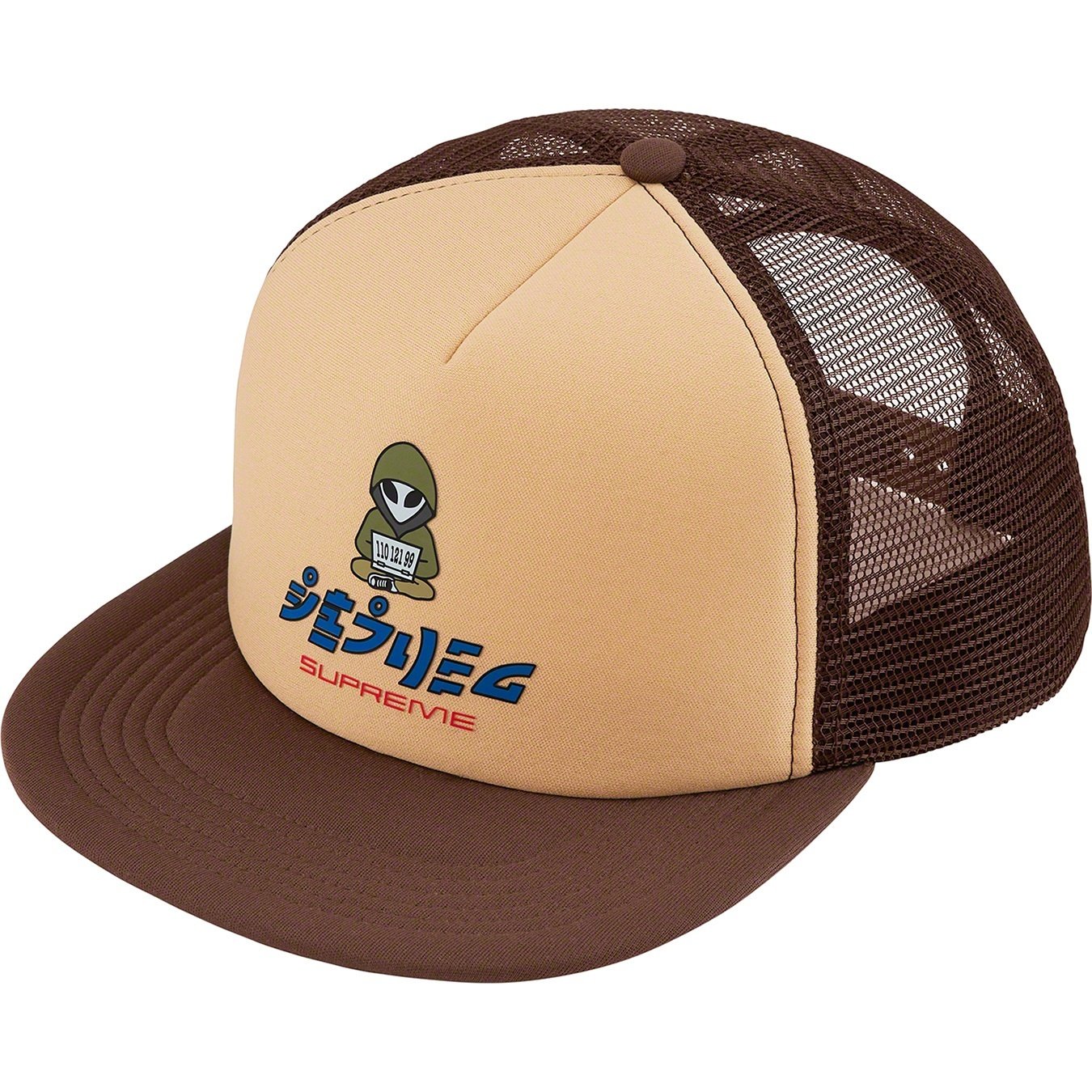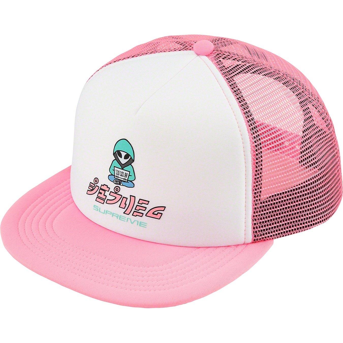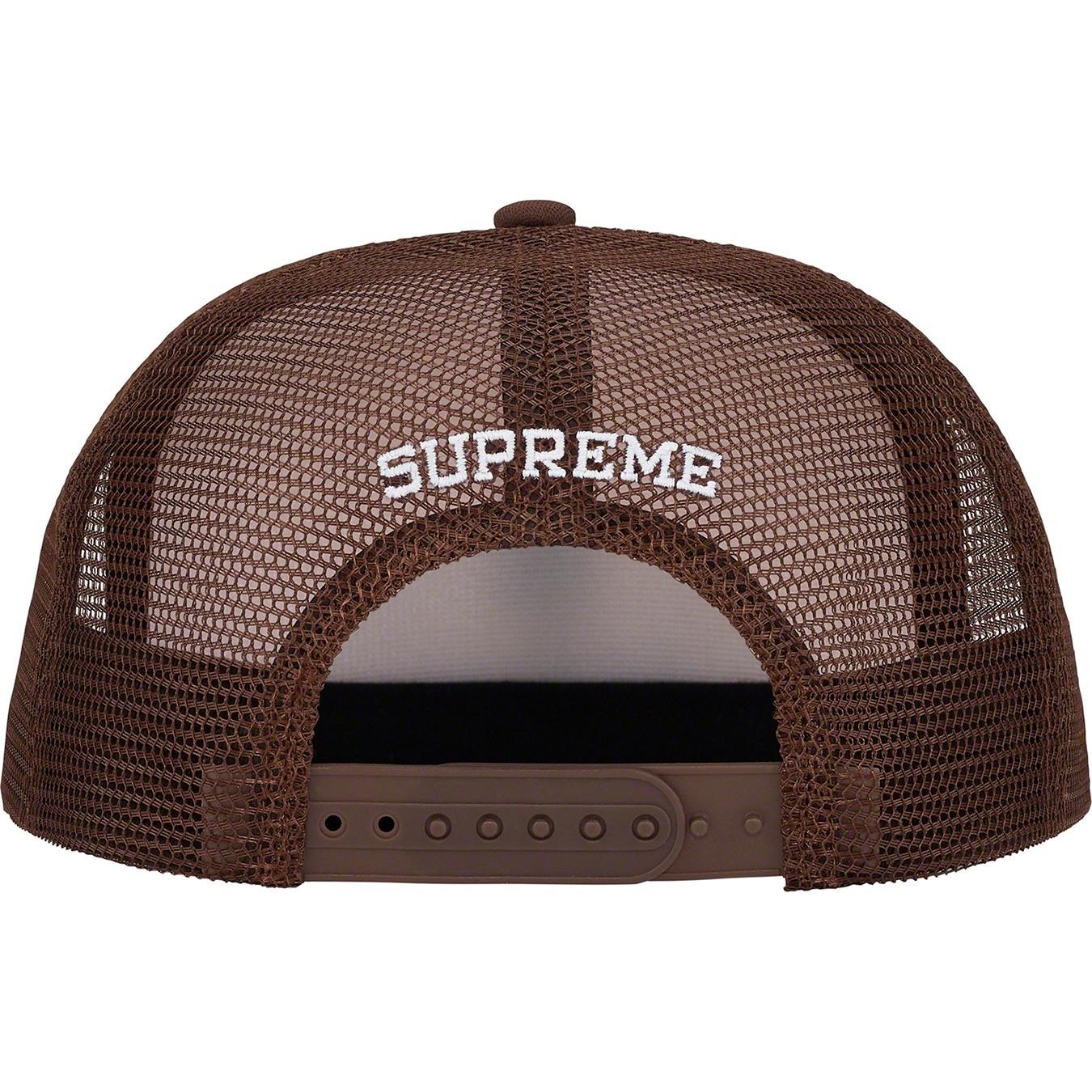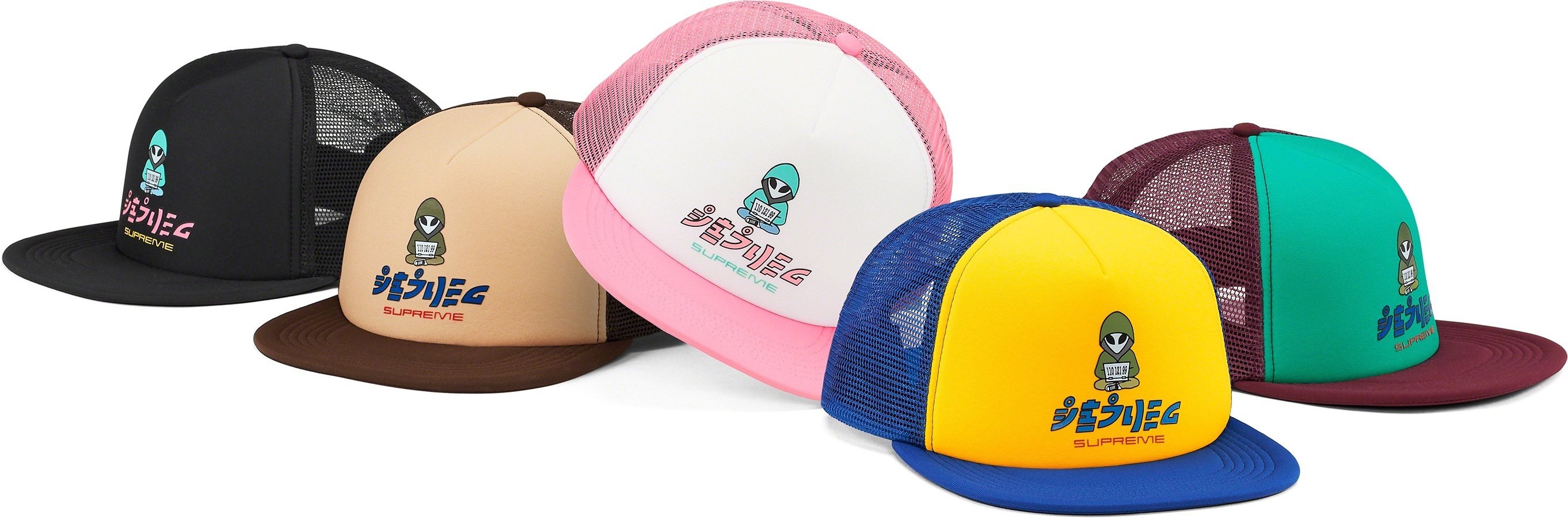 Poly 5-Panel hat with mesh back and snap closure. Printed graphic on front and embroidered logo on back.