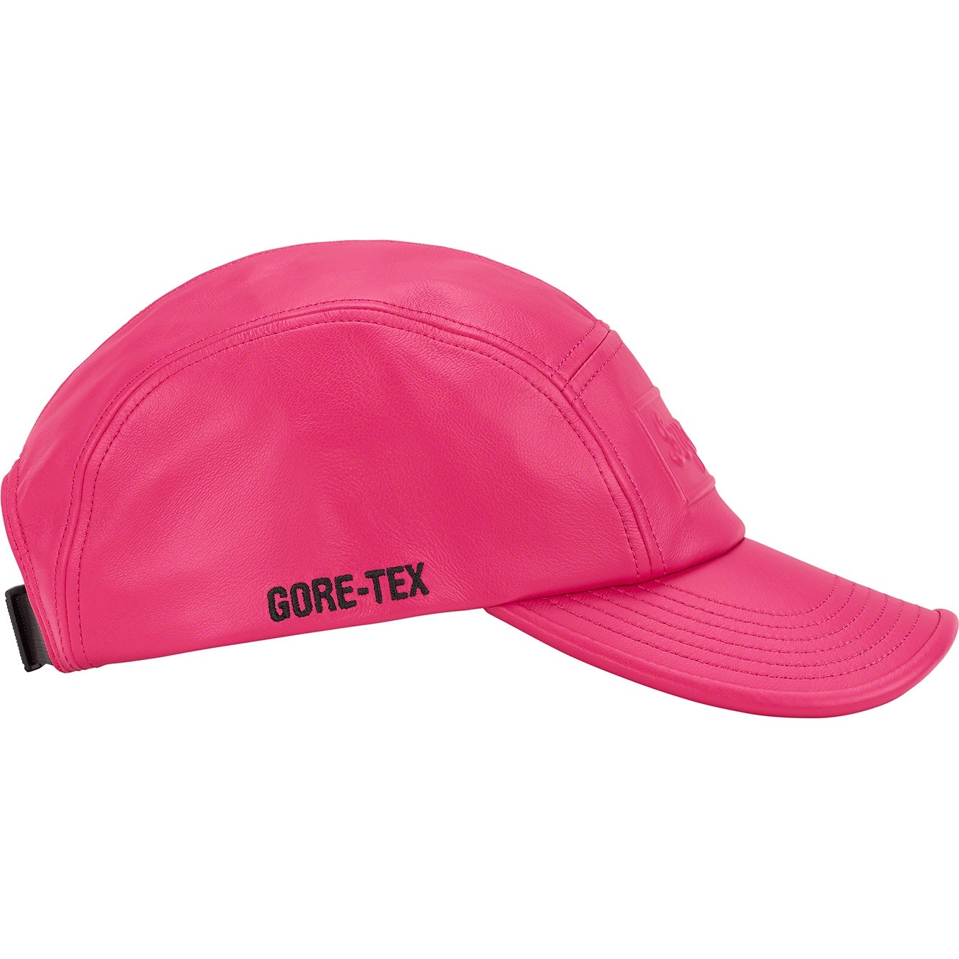 Lambskin leather Supreme camp cap with waterproof, breathable GORE-TEX interlining and taped seams. Embossed logo at front and embroidered logo on side.