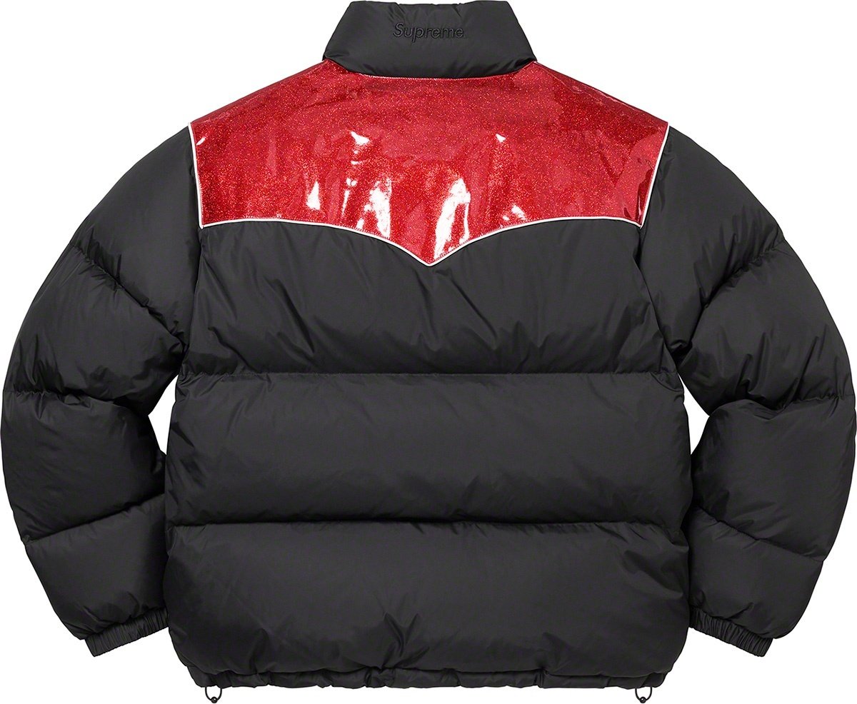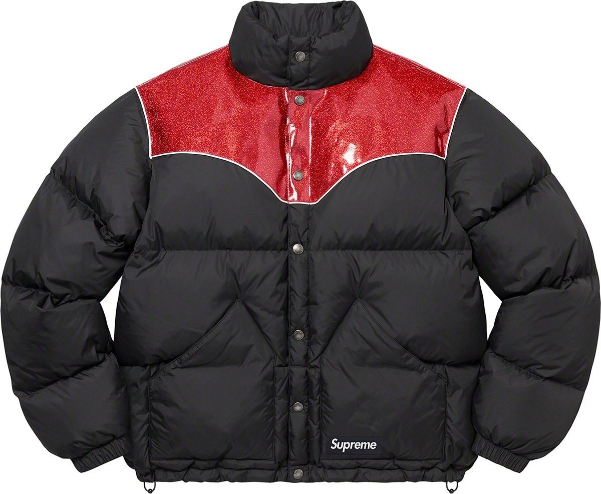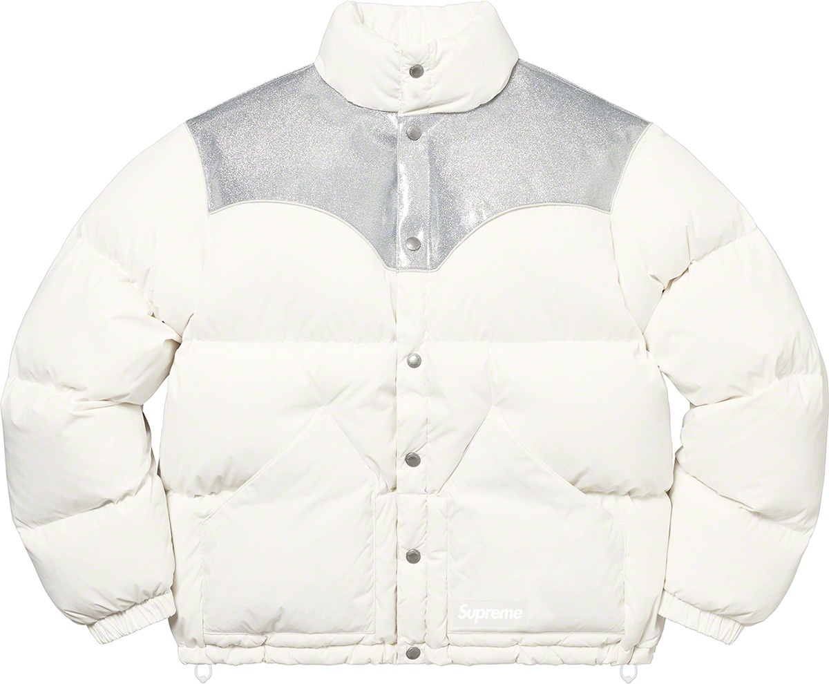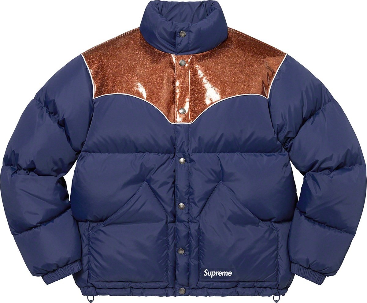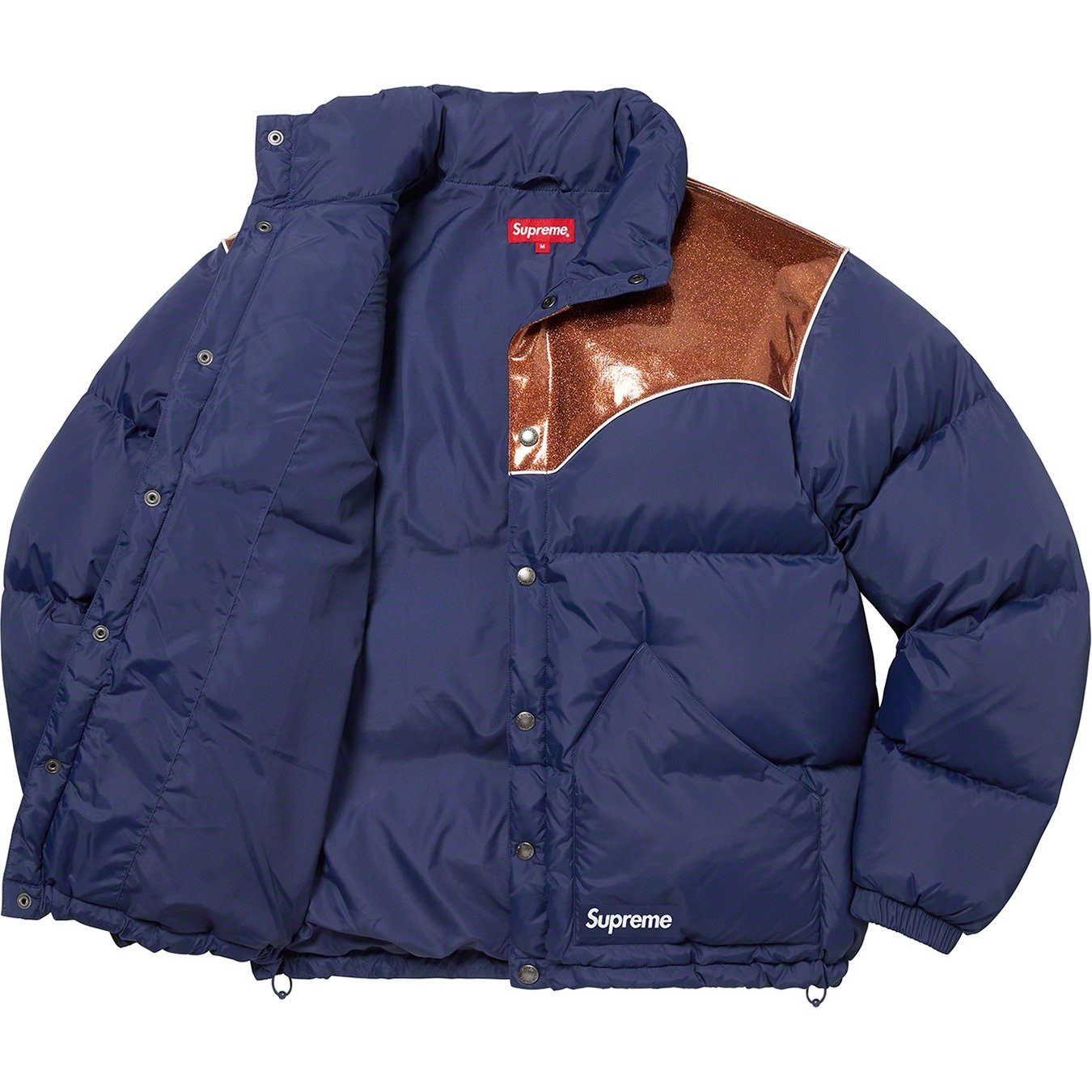 Water resistant nylon with glitter vinyl yoke, down insulated quilted baffles and taffeta lining. Snap front closure with patch pockets at lower front and interior zip pocket. Interior elastic shockcord at hem with elastic cuffs. Woven logo label at pocket and embroidered logo on back neck.