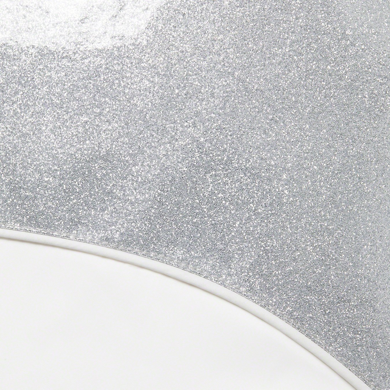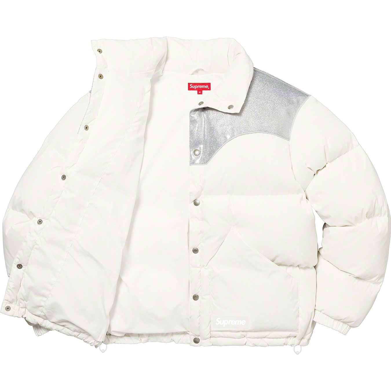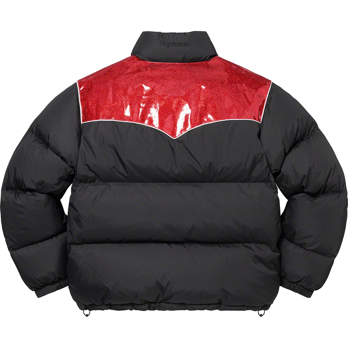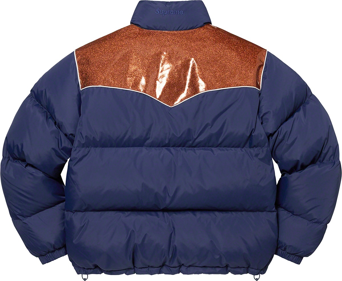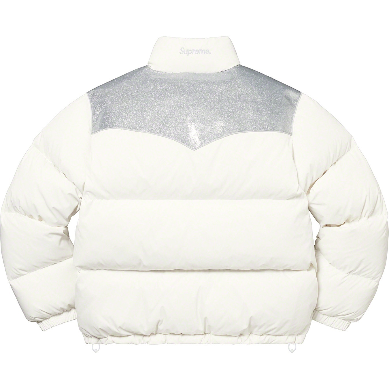 Water resistant nylon with glitter vinyl yoke, down insulated quilted baffles and taffeta lining. Snap front closure with patch pockets at lower front and interior zip pocket. Interior elastic shockcord at hem with elastic cuffs. Woven logo label at pocket and embroidered logo on back neck.