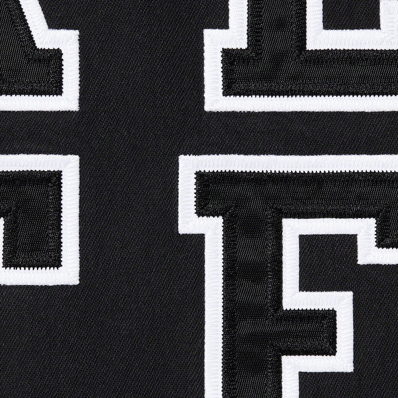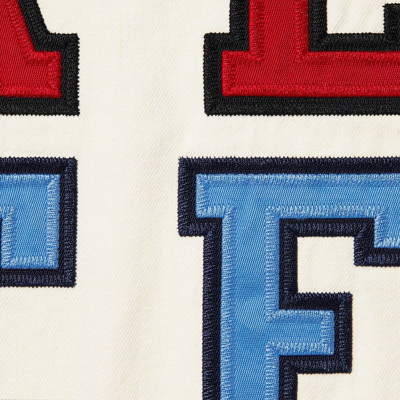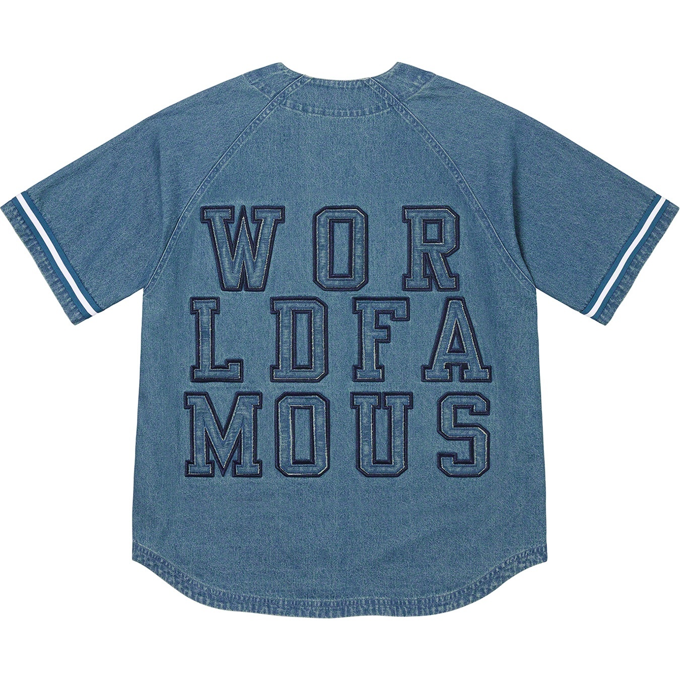 All cotton denim with button front closure and stripe rib armholes. Tackle twill logo appliqué at front and graphic appliqué at back. Athletic label at lower front.