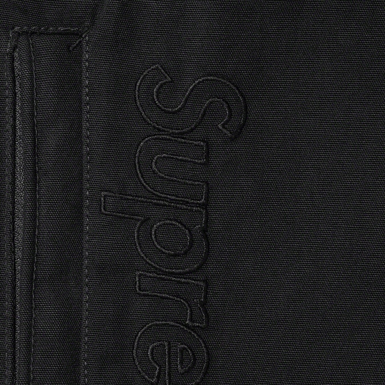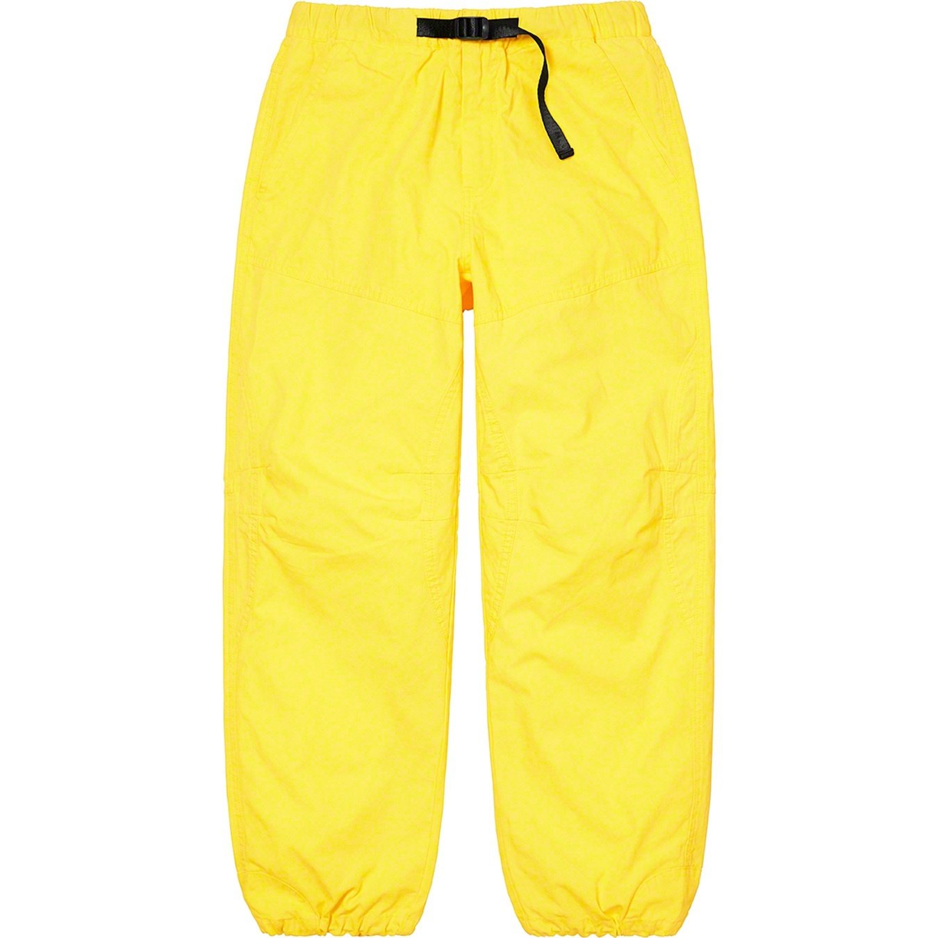All cotton twill with slanted front hand pockets and welt back pocket. Zip pocket at back thigh. Waistband with zip fly, webbing belt and plastic slider. Interior elastic shockcord at cuffs. Embroidered logo at back pocket.