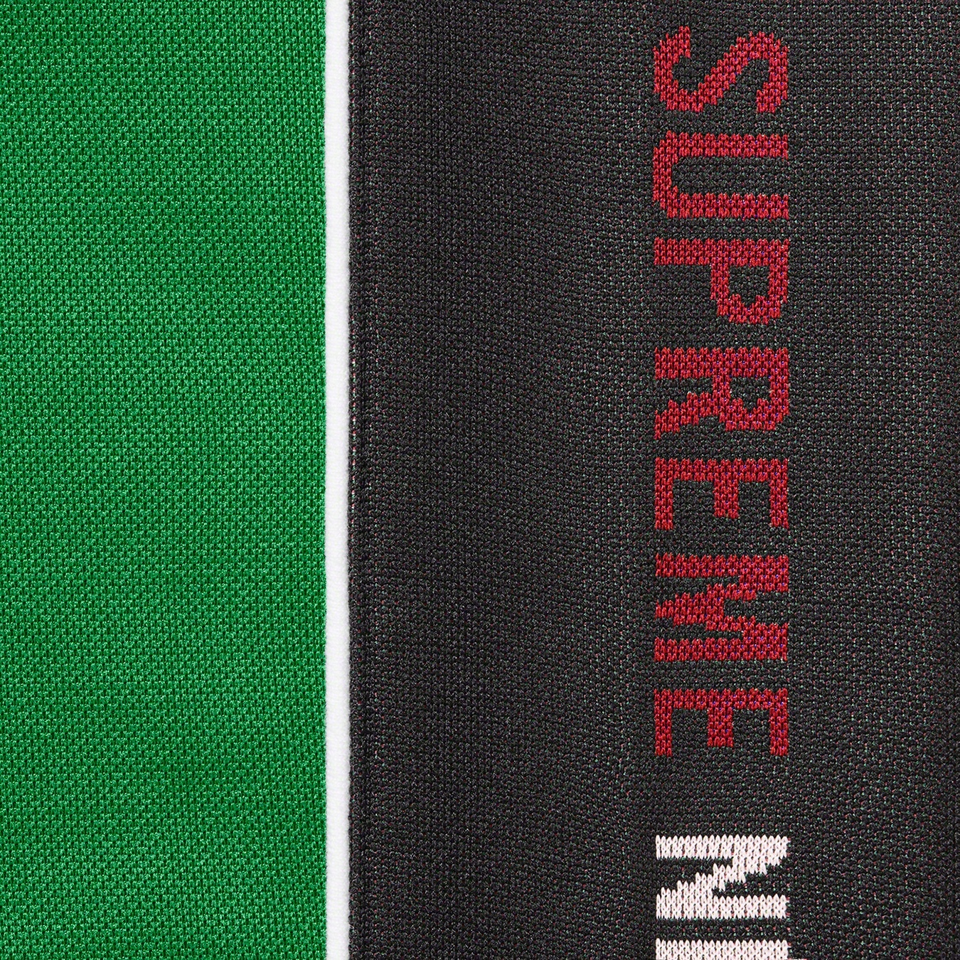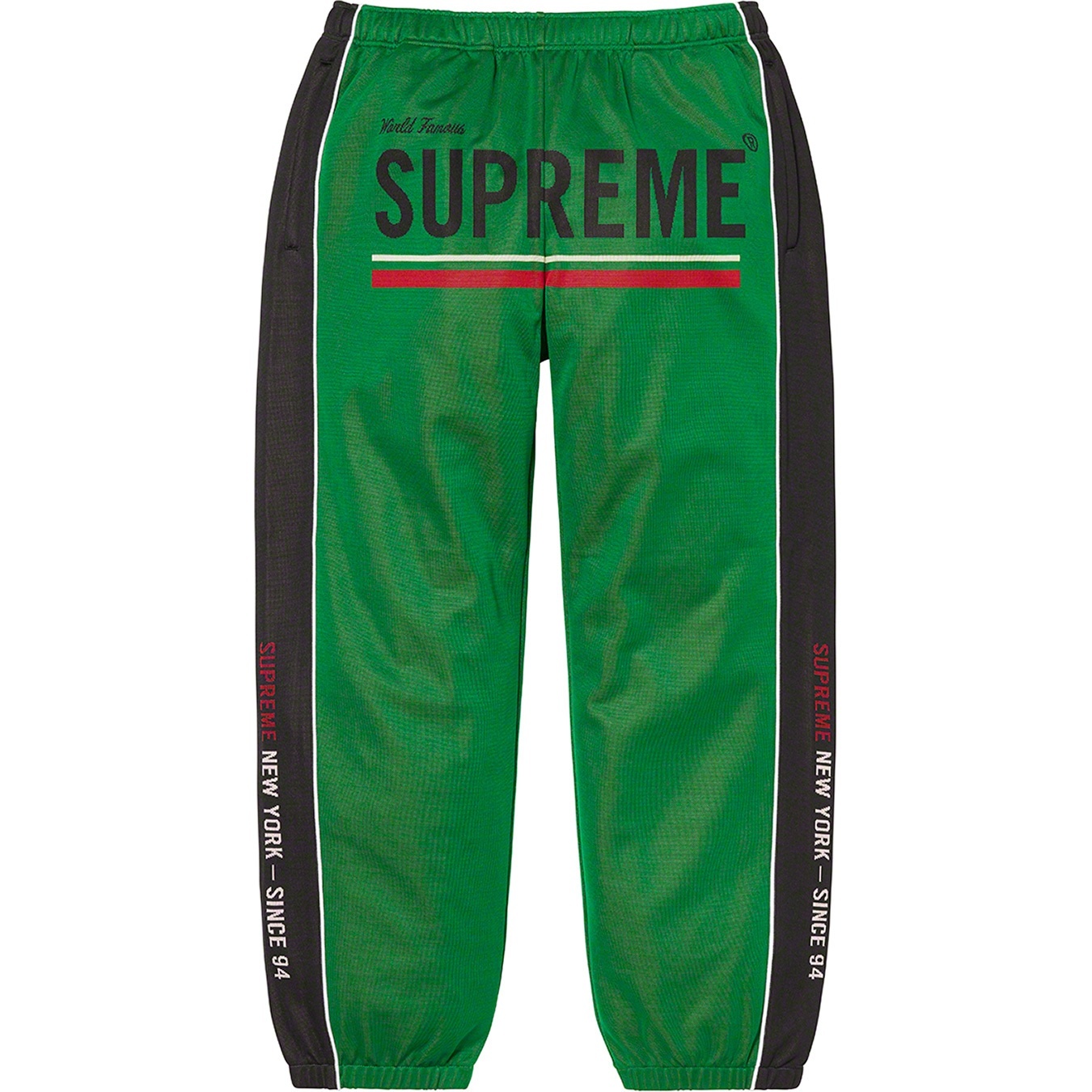 Poly with contrast panels and piping. On seam hand pockets and single back zip pocket. Elastic cuffs and waistband with interior drawcord and interior hanging key pocket. Jacquard knit logos at front and sides.