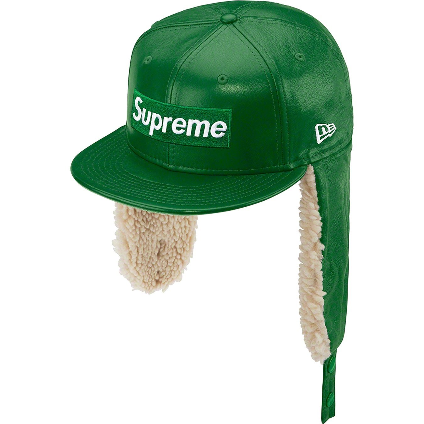 Lambskin leather New Era® 59FIFTY earflap baseball hat with faux shearling lining. Embroideries on front, side and back.