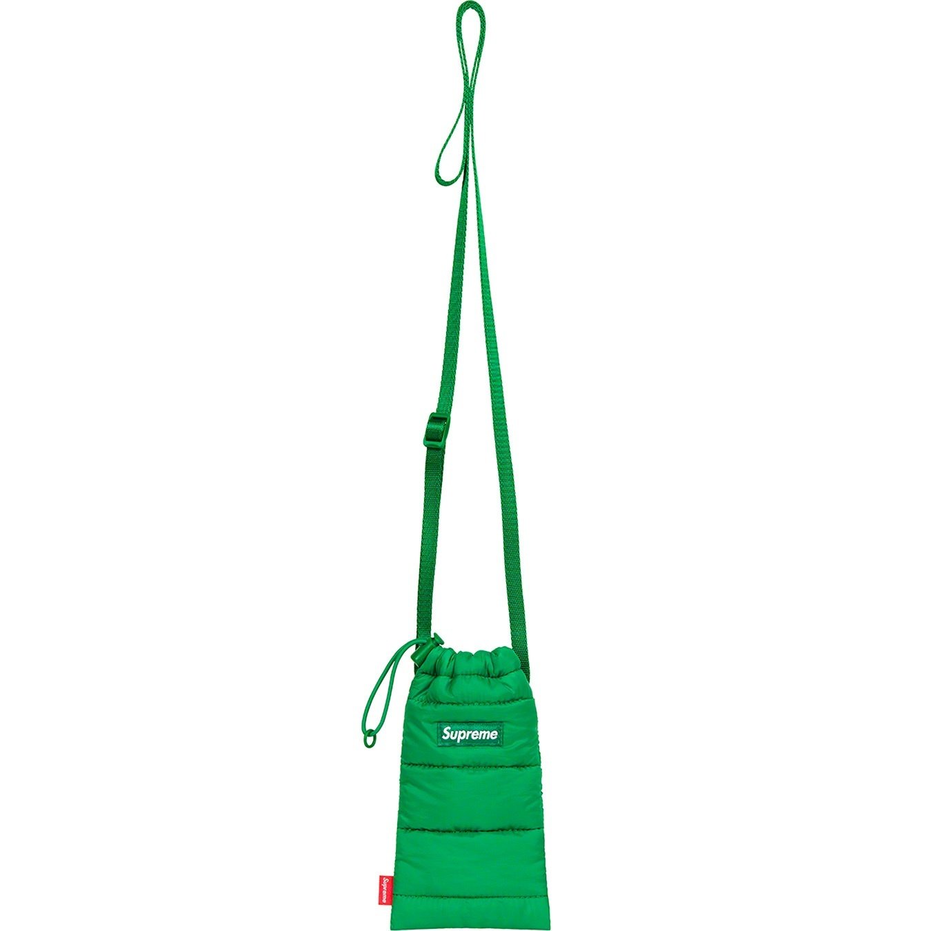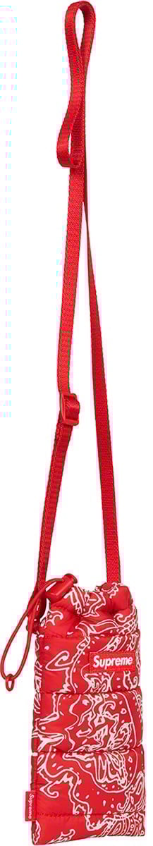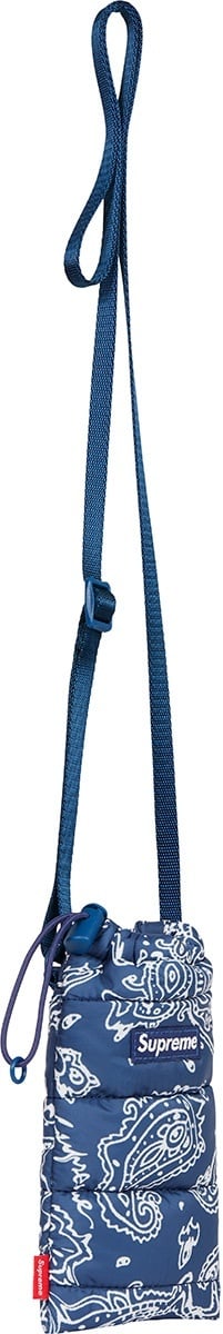 Water resistant Pertex® poly with quilted baffles and nylon lining. Main compartment with interior elastic shockcord closure. Adjustable webbing strap. Woven logo label at front. 7" x 3.7".