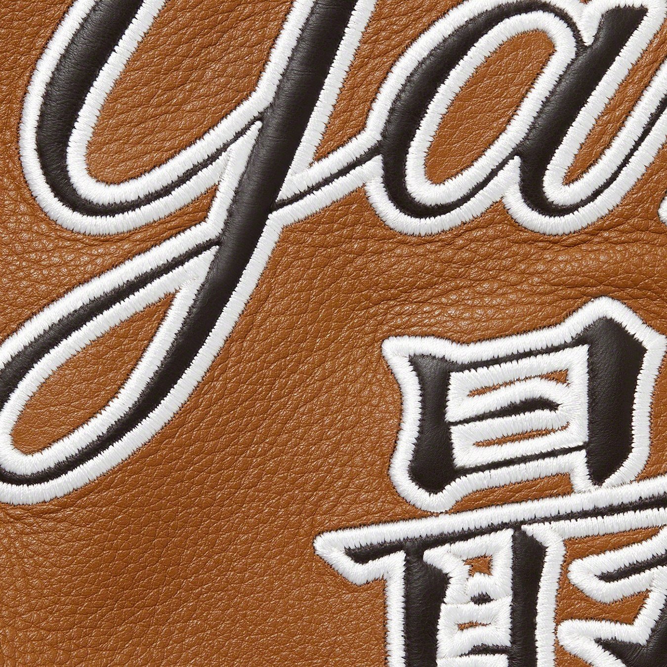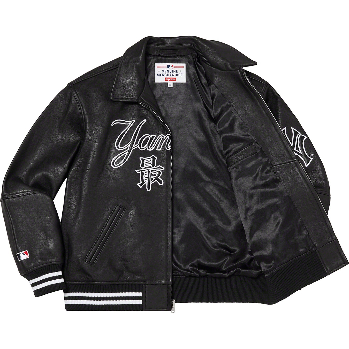 Pebbled cowhide leather with satin lining. Full zip closure with double welt hand pockets at lower front and interior chest pocket. Stripe rib cuffs and hem. Lambskin leather logo appliqué at front, sleeve and back. Embroidered logo on back neck and patch on cuff. Official Yankees™ merchandise made exclusively for Supreme.