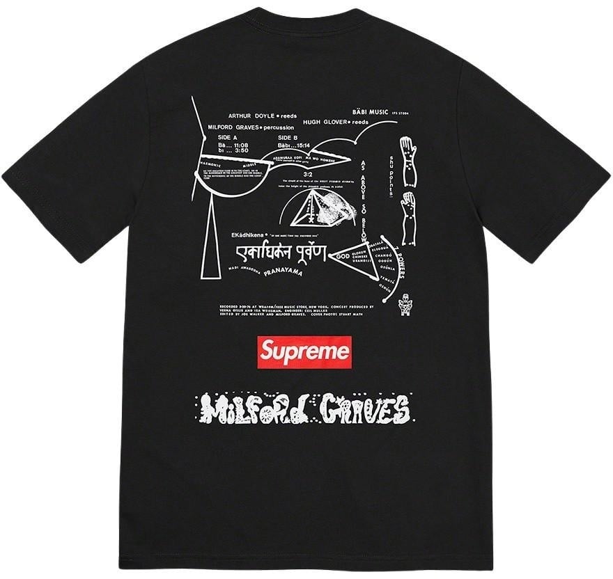 All cotton classic Supreme t-shirt with printed graphic on front and back. Original artwork by Milford Graves.