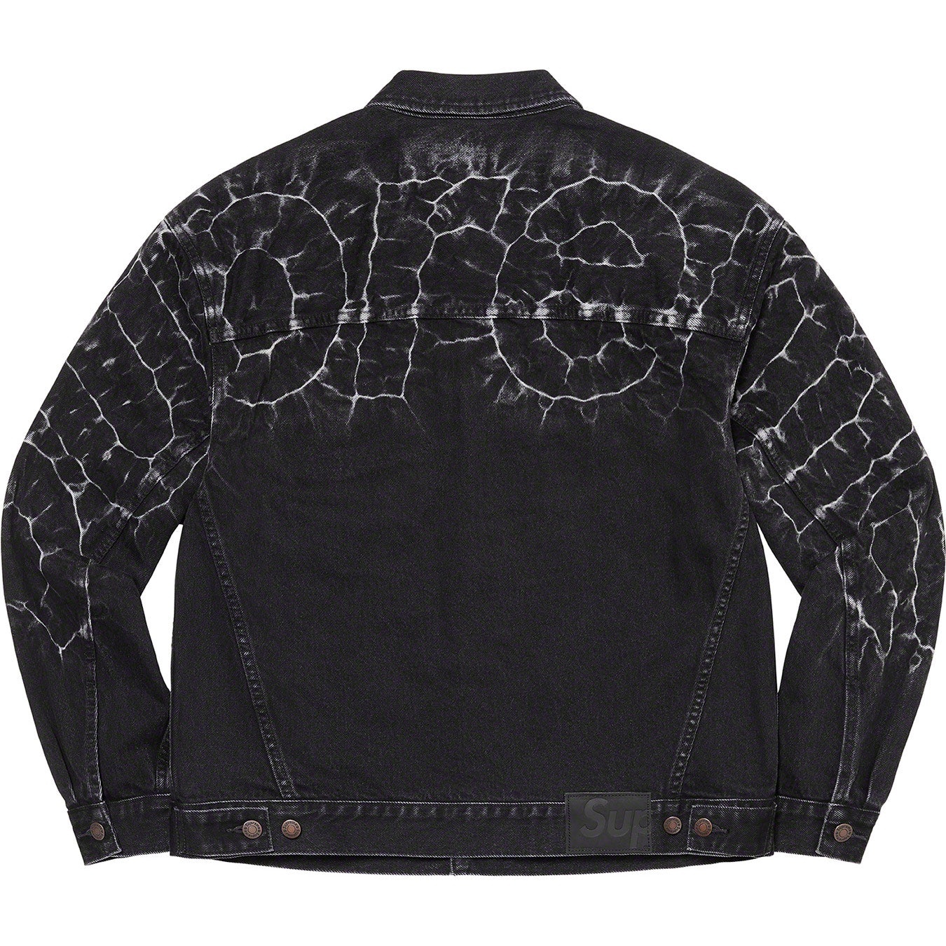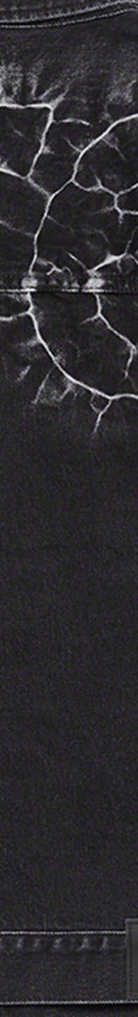 All cotton 13 oz. denim. Button front closure with on seam hand pockets at lower front and button flap patch pockets at chest. Tab adjusters at cuffs and back hem with leather logo patch. Shibori dyed logo at back shoulders and sleeves.