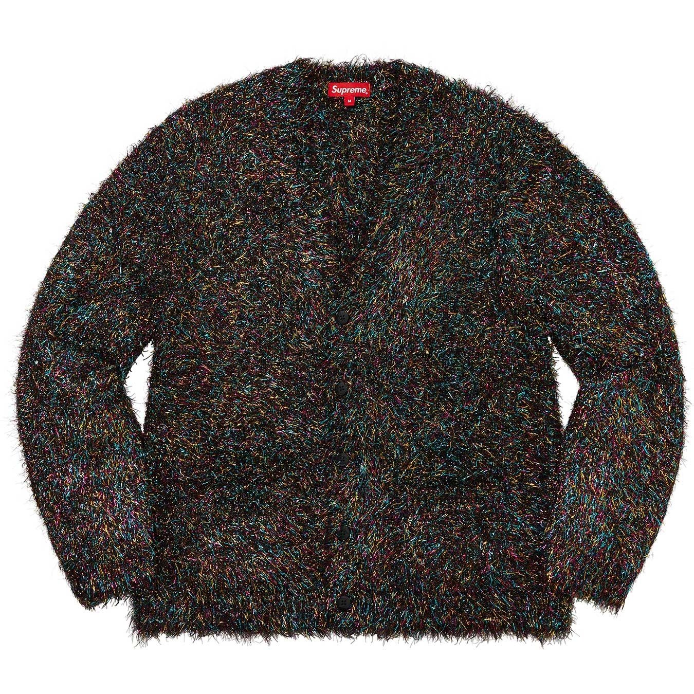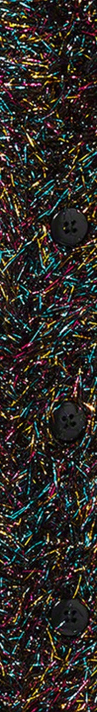 Metallic yarn with button front closure and hand pockets at lower front. Embroidered logo on left pocket.