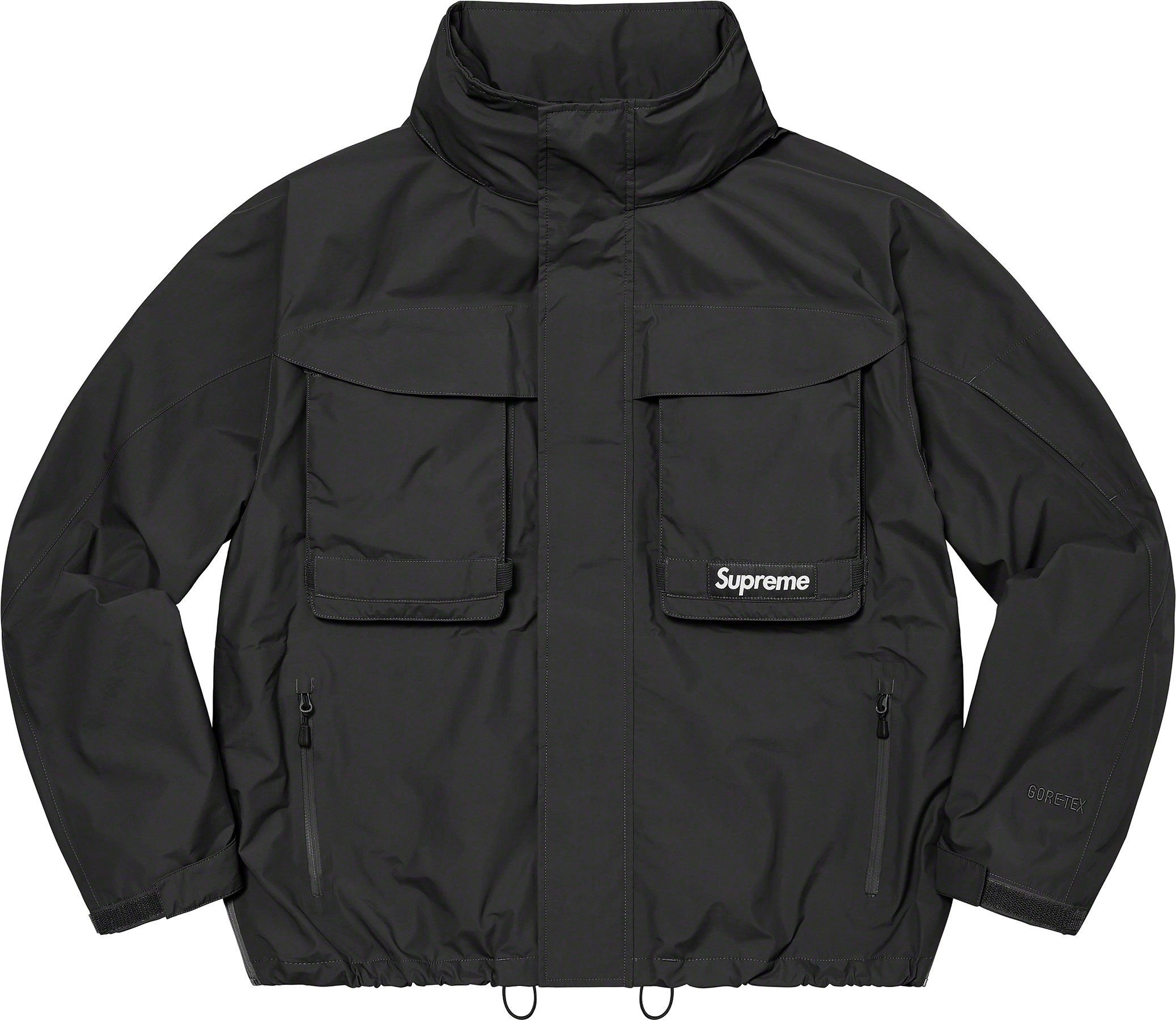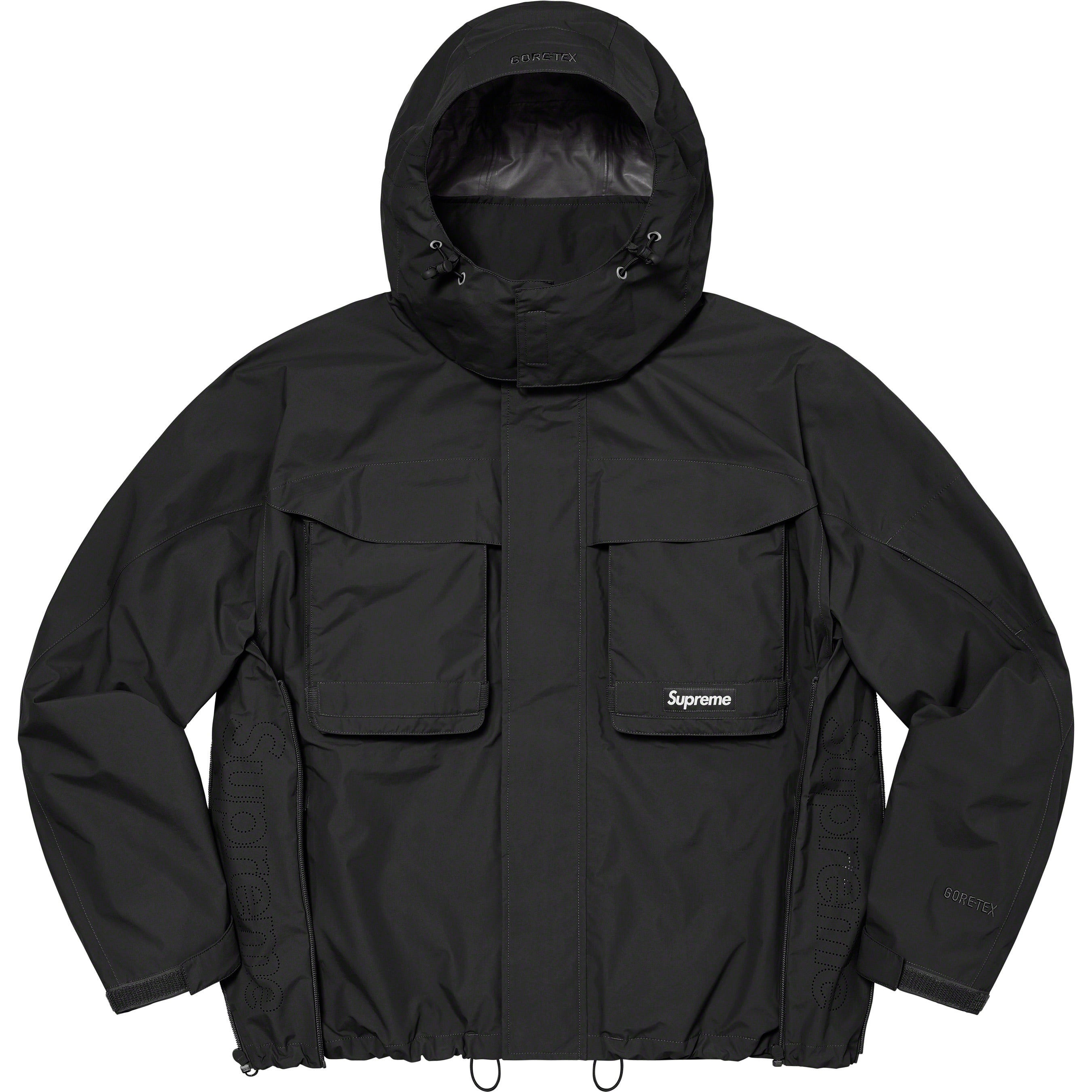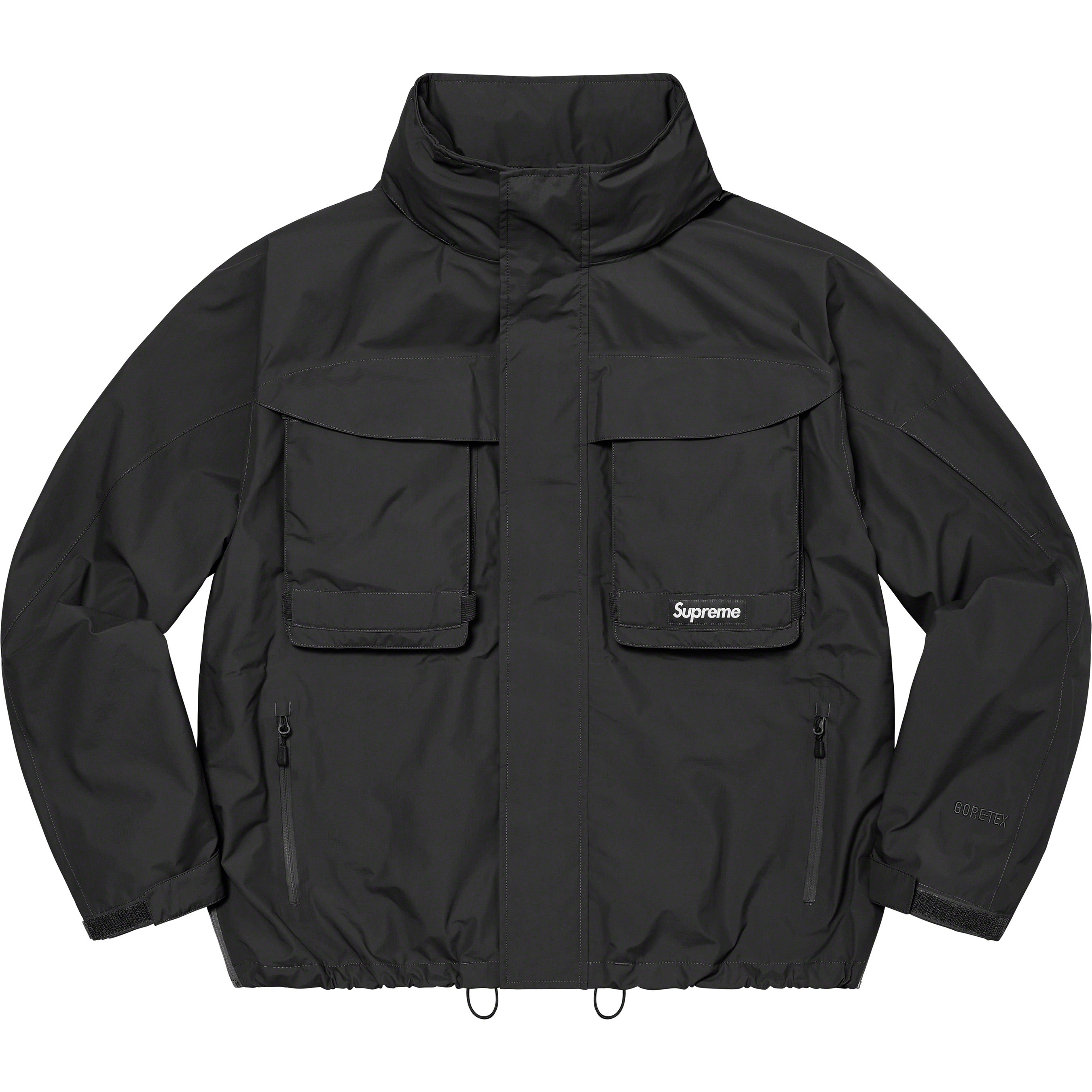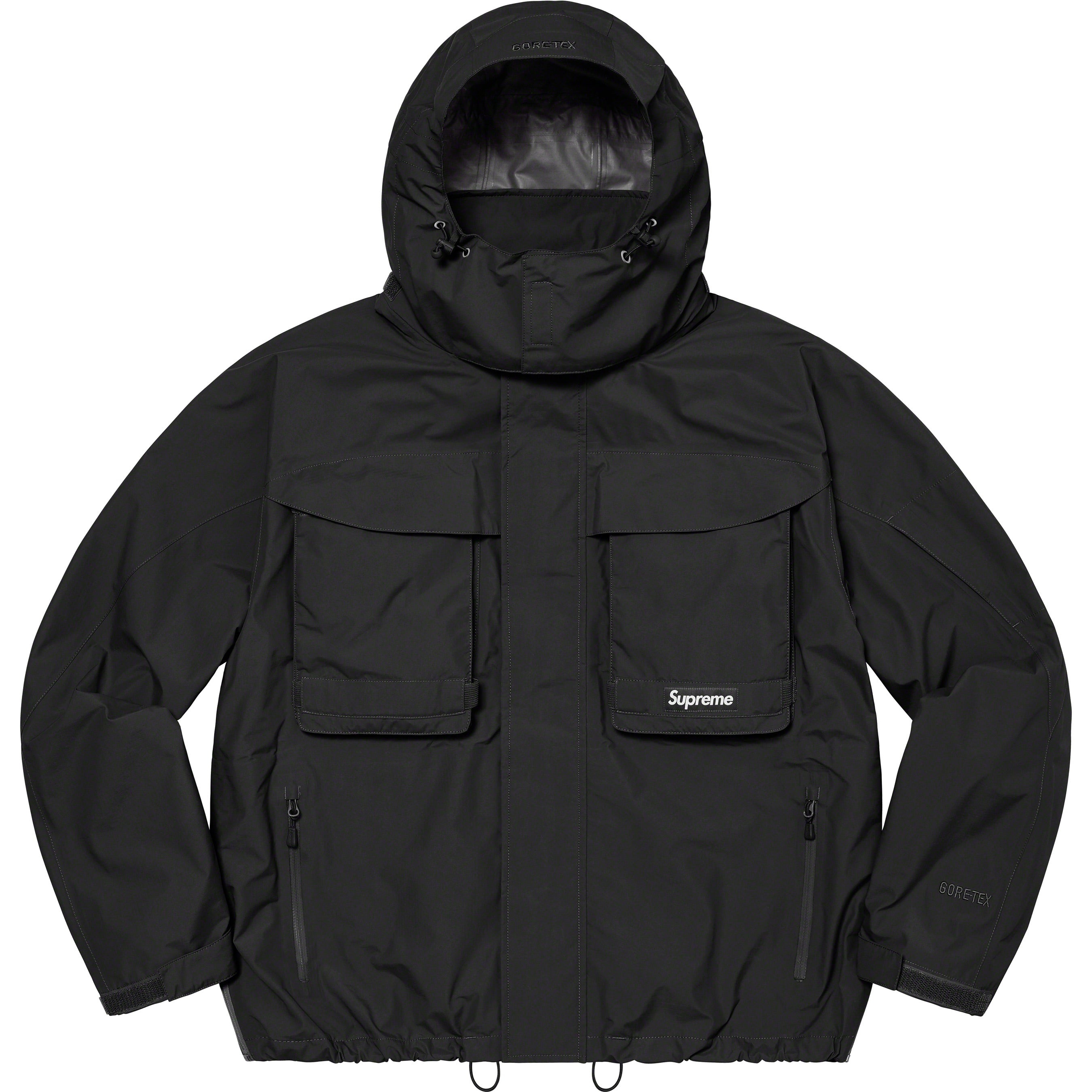 Waterproof, breathable GORE-TEX PACLITE® ripstop shell with taped seams. Full zip closure with hidden velcro placket. Zip hand pockets at lower front. Velcro flap patch pockets at chest with dual top and side entry. Hidden zip pocket at sleeve. Interior elastic shockcord at packable hood and hem with velcro tab adjusters at cuffs. Side zip gussets with perforated logos. Woven logo labels at chest pocket and back neck tab. Embroidered logos at hood and cuff.