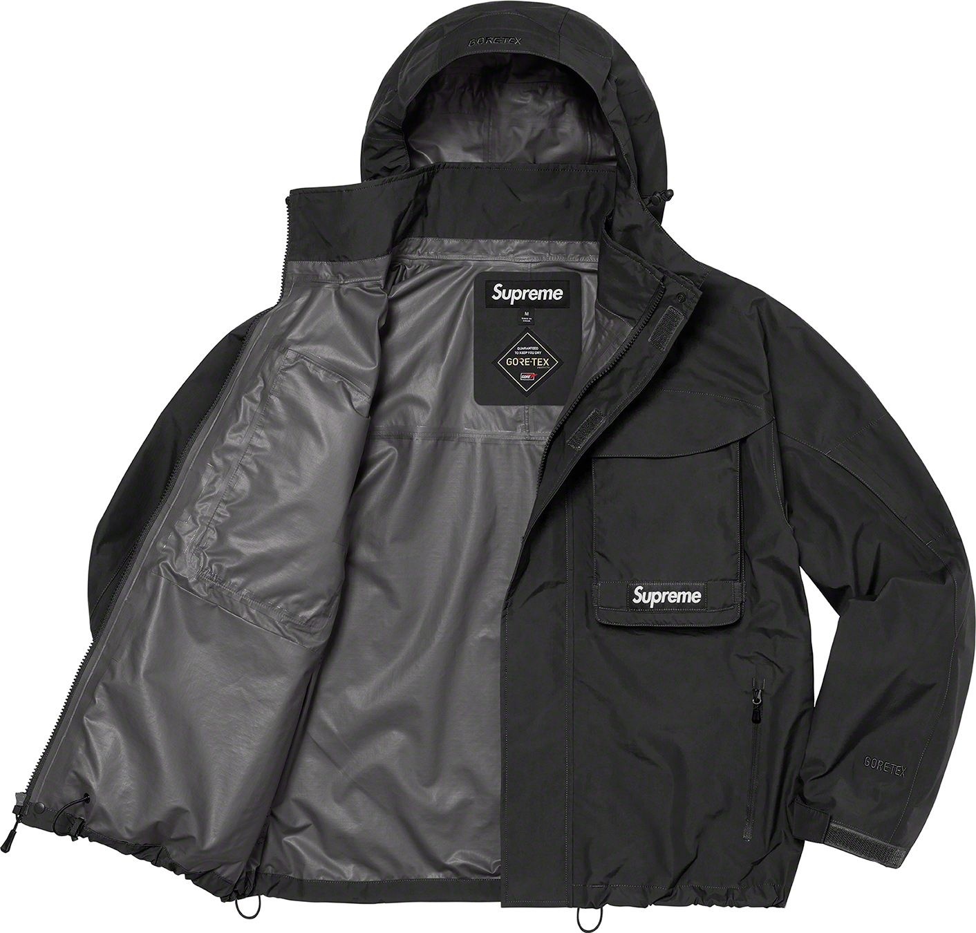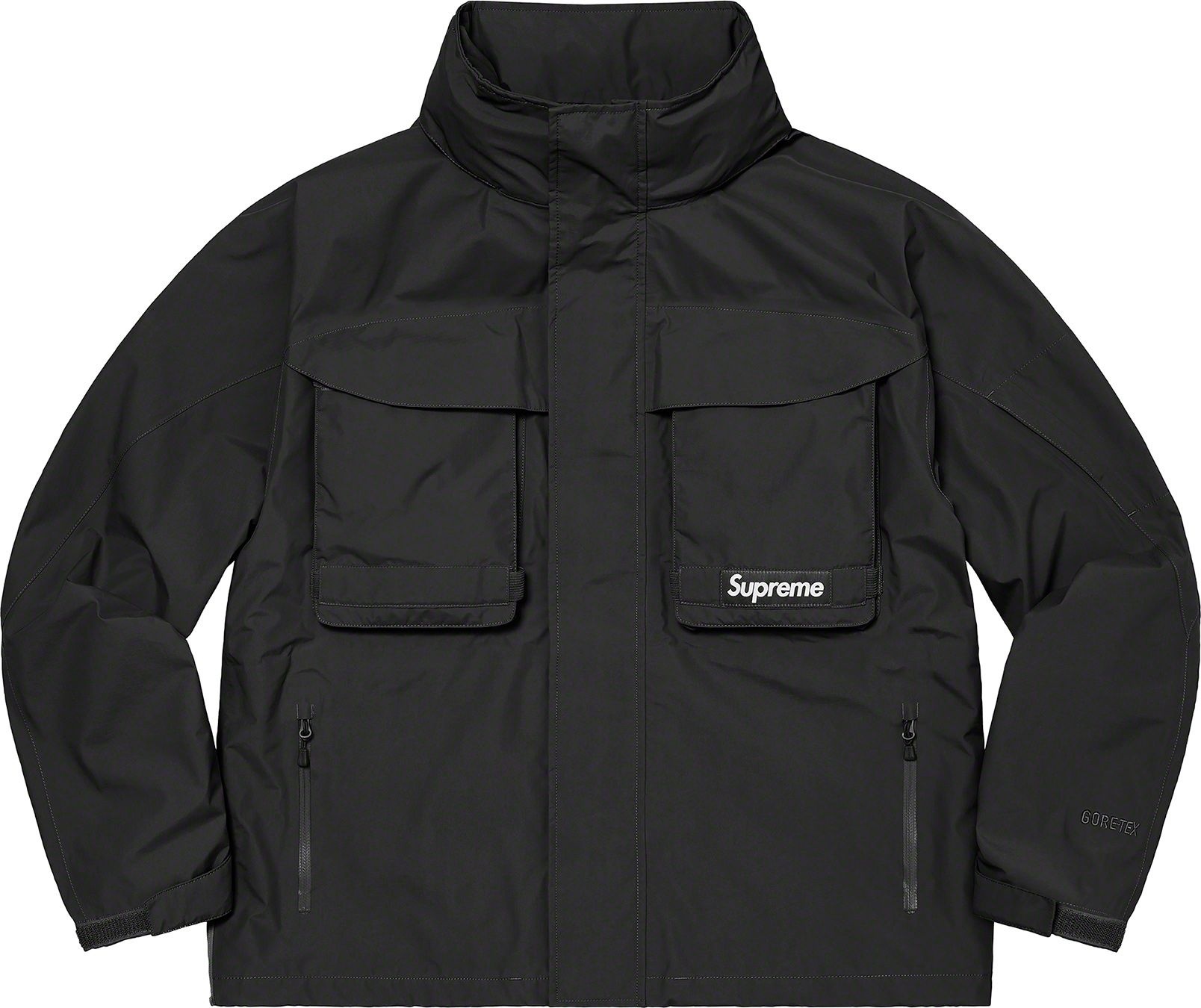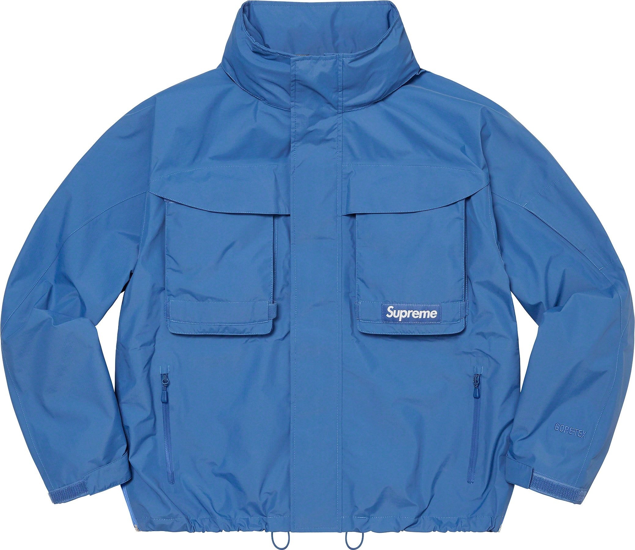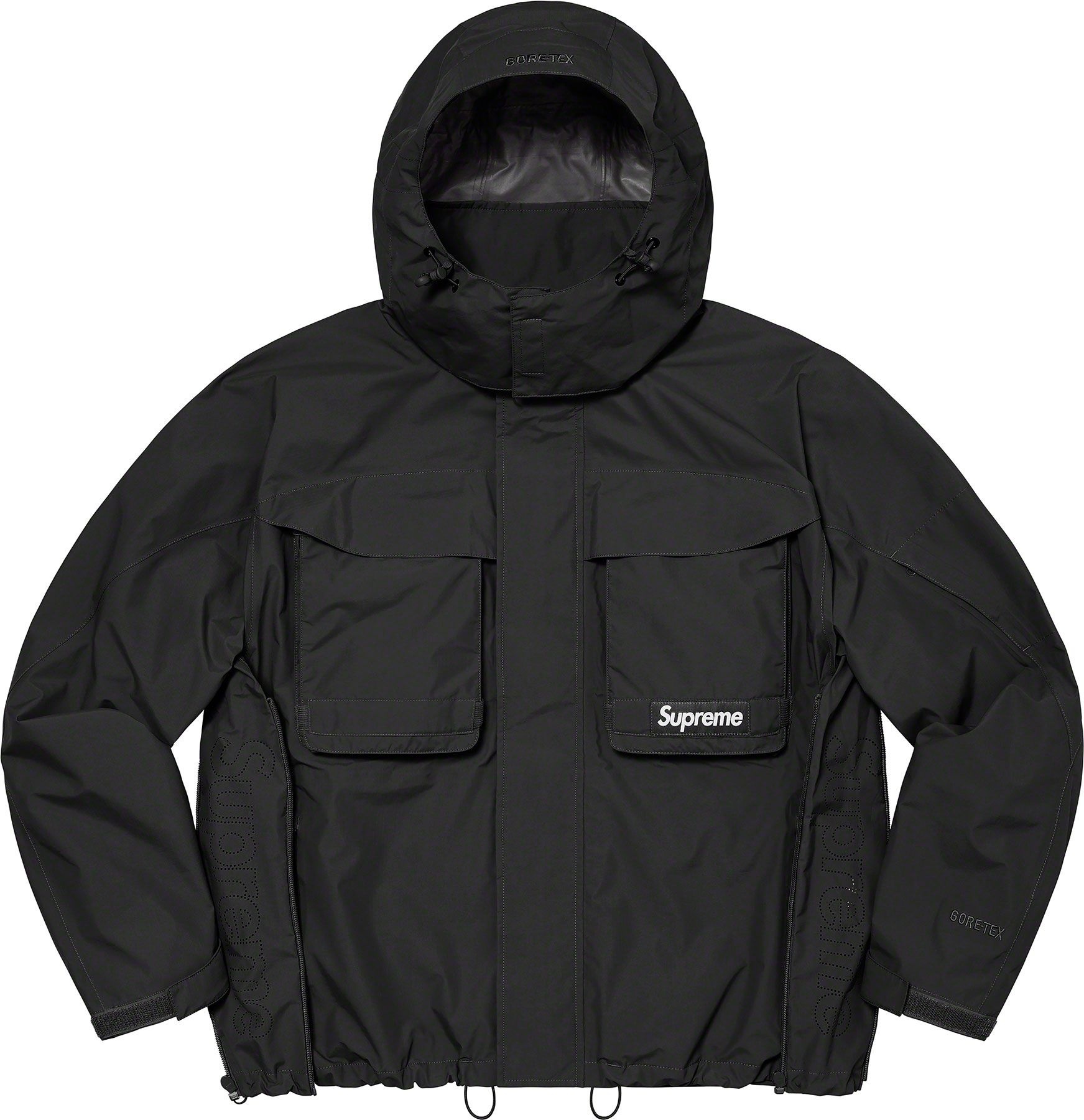 Waterproof, breathable GORE-TEX PACLITE® ripstop shell with taped seams. Full zip closure with hidden velcro placket. Zip hand pockets at lower front. Velcro flap patch pockets at chest with dual top and side entry. Hidden zip pocket at sleeve. Interior elastic shockcord at packable hood and hem with velcro tab adjusters at cuffs. Side zip gussets with perforated logos. Woven logo labels at chest pocket and back neck tab. Embroidered logos at hood and cuff.