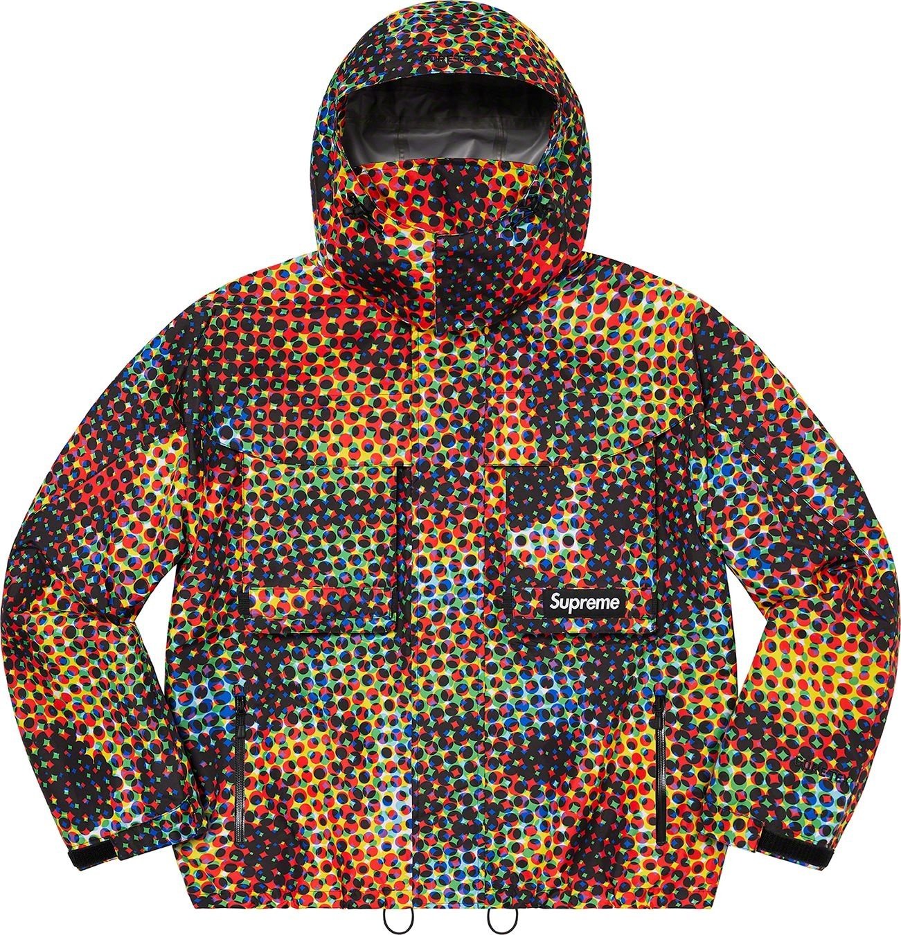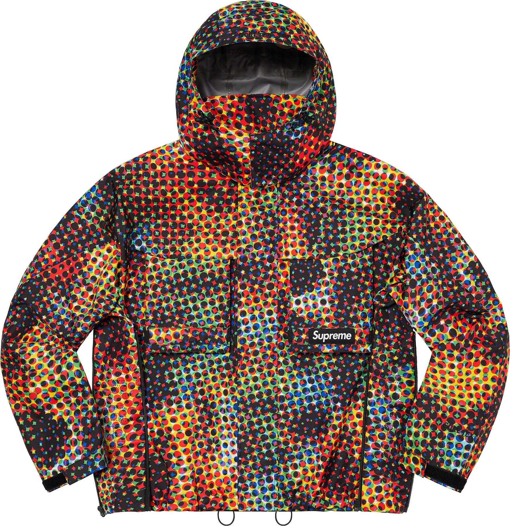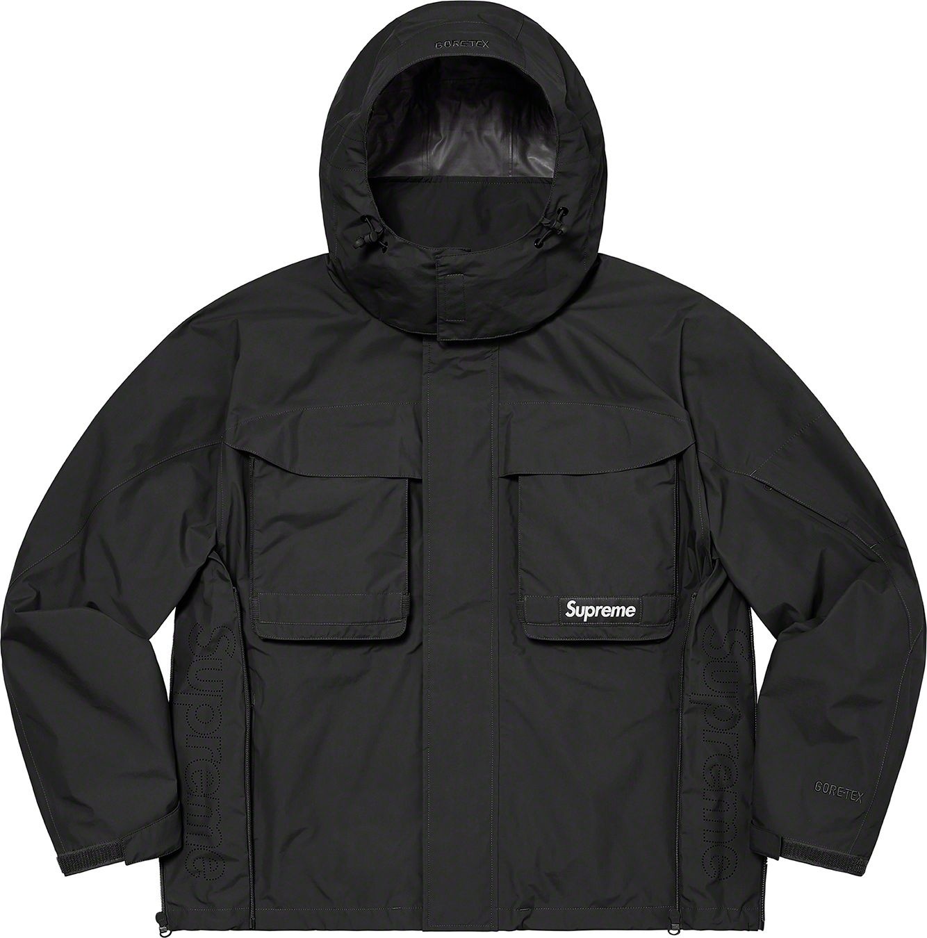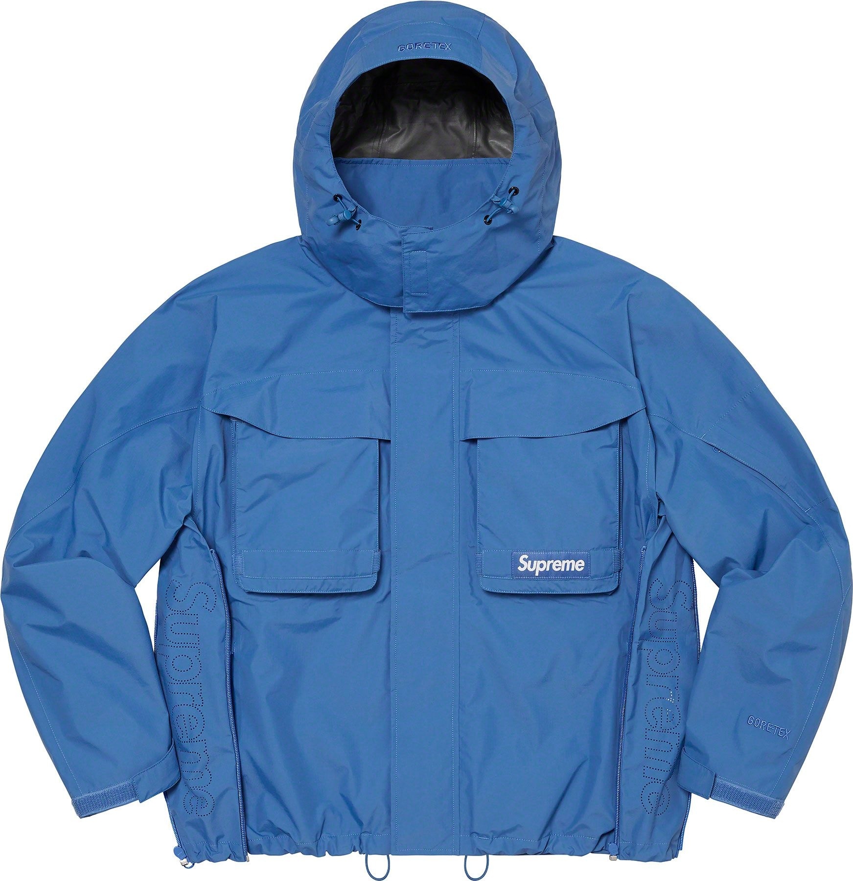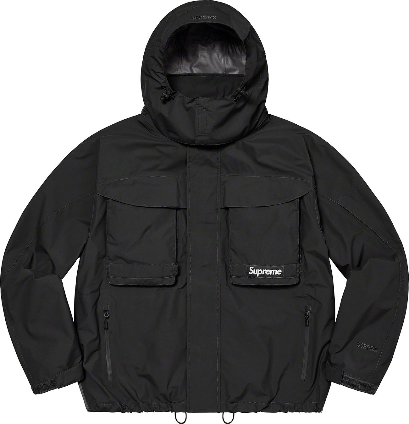 Waterproof, breathable GORE-TEX PACLITE® ripstop shell with taped seams. Full zip closure with hidden velcro placket. Zip hand pockets at lower front. Velcro flap patch pockets at chest with dual top and side entry. Hidden zip pocket at sleeve. Interior elastic shockcord at packable hood and hem with velcro tab adjusters at cuffs. Side zip gussets with perforated logos. Woven logo labels at chest pocket and back neck tab. Embroidered logos at hood and cuff.
