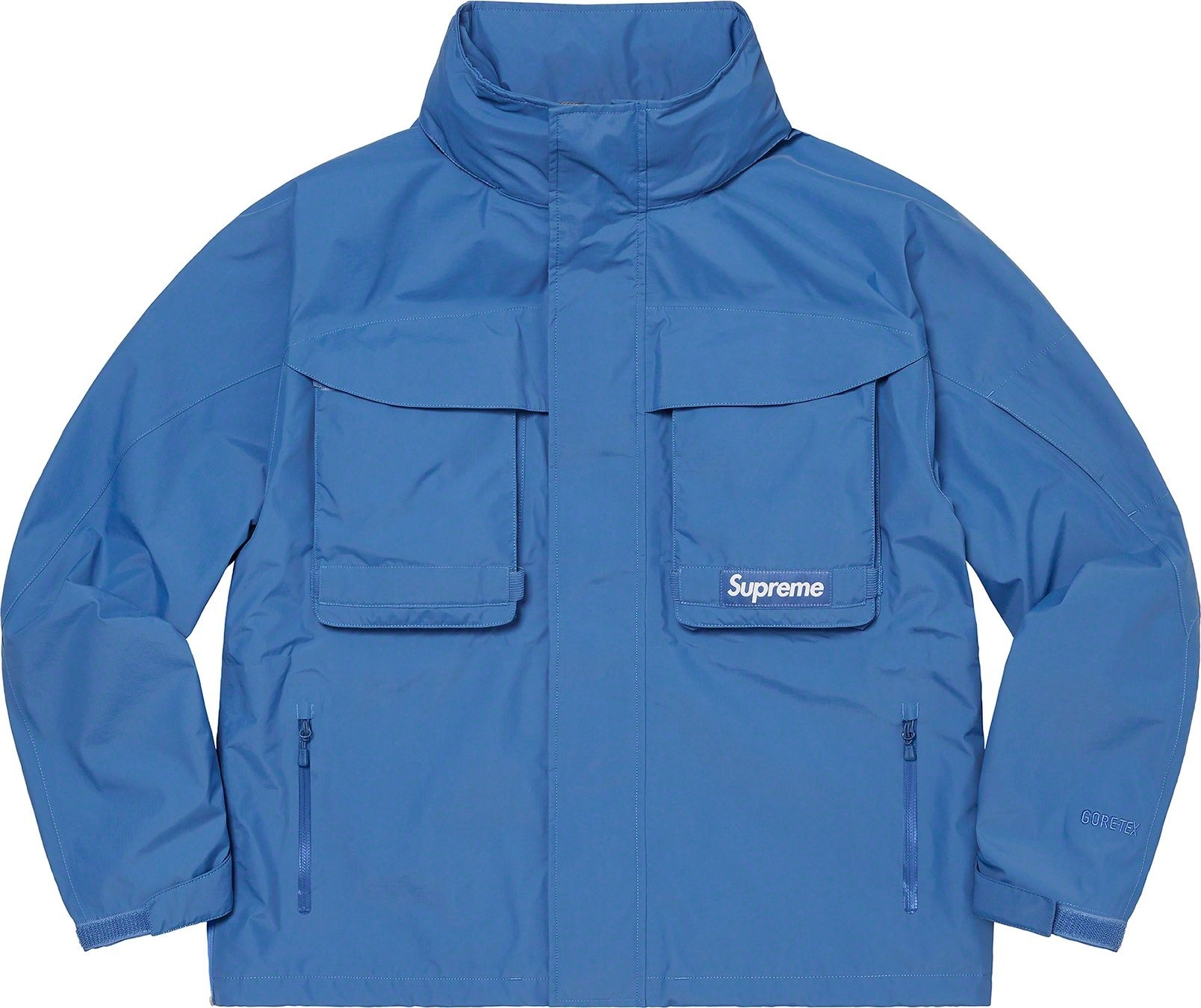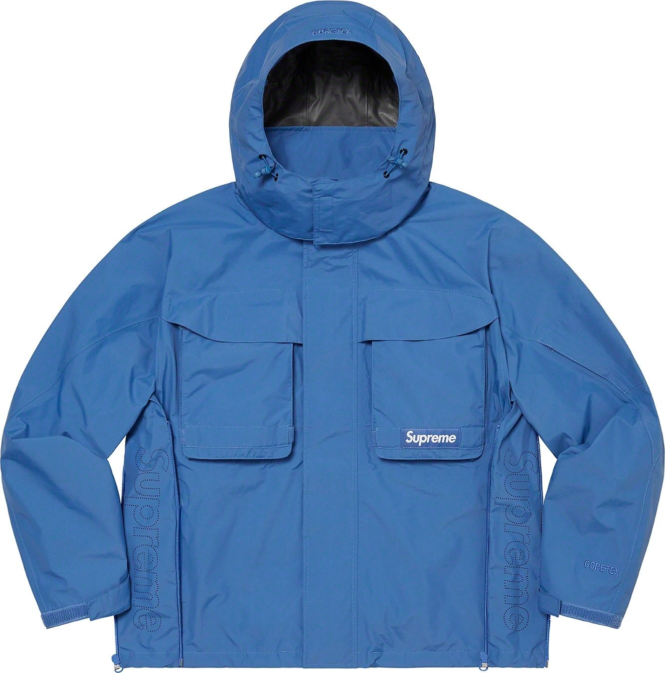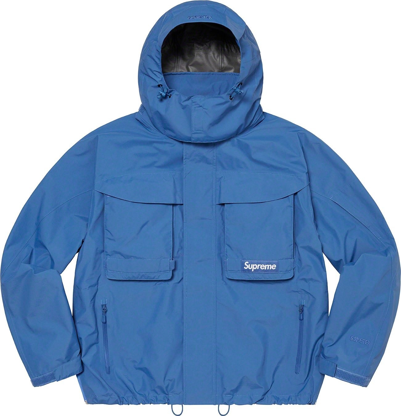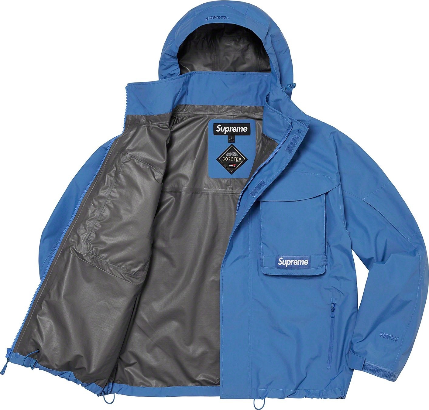 Waterproof, breathable GORE-TEX PACLITE® ripstop shell with taped seams. Full zip closure with hidden velcro placket. Zip hand pockets at lower front. Velcro flap patch pockets at chest with dual top and side entry. Hidden zip pocket at sleeve. Interior elastic shockcord at packable hood and hem with velcro tab adjusters at cuffs. Side zip gussets with perforated logos. Woven logo labels at chest pocket and back neck tab. Embroidered logos at hood and cuff.