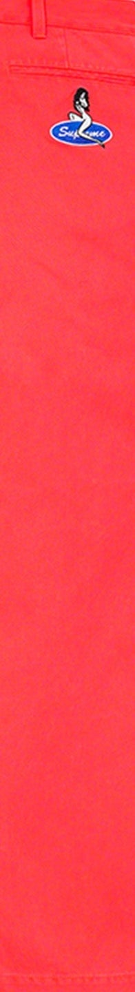 All cotton chino twill with enzyme wash. Relaxed fit with on seam hand pockets, welt back pockets, hidden coin pocket and button fly closure. Embroidered logo on back pocket.
