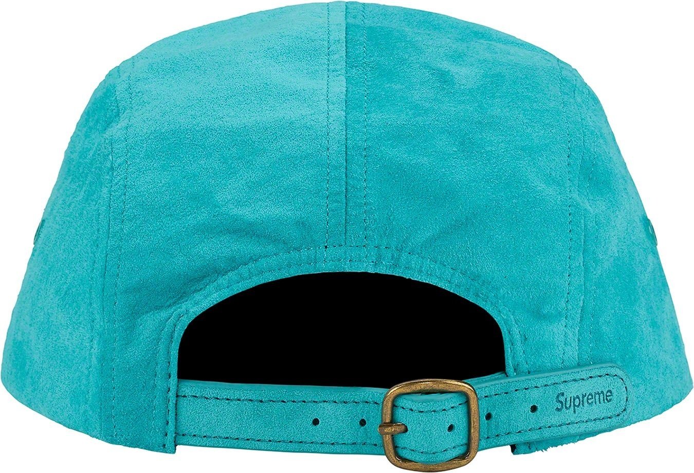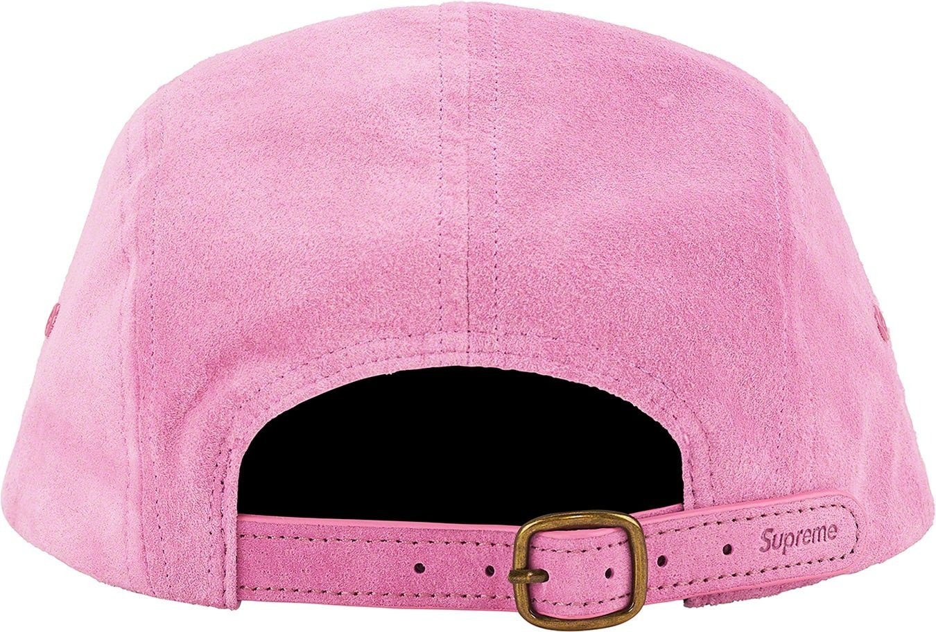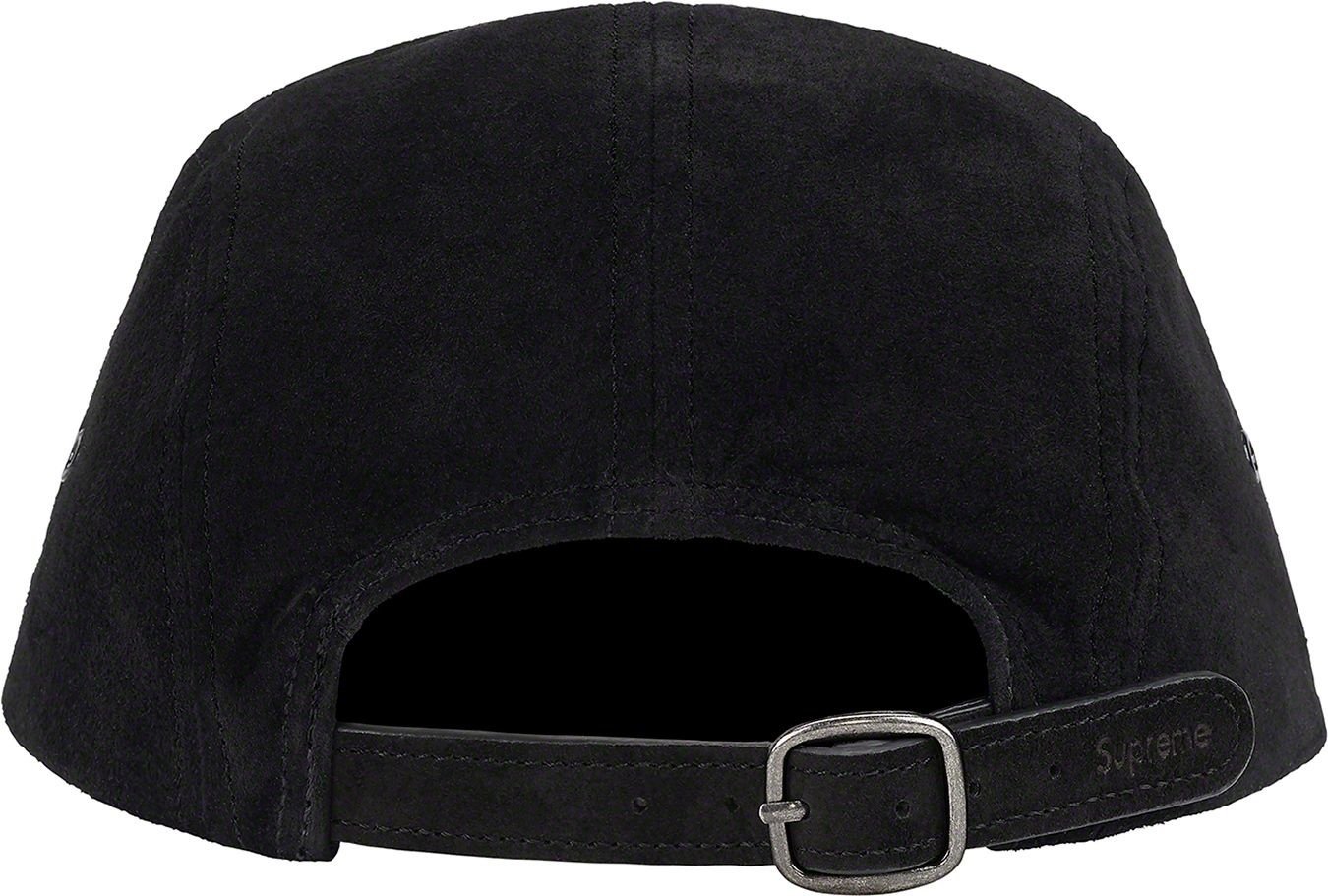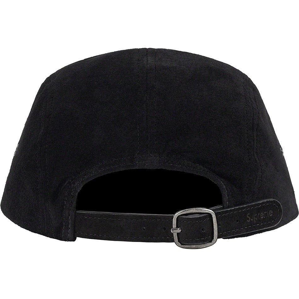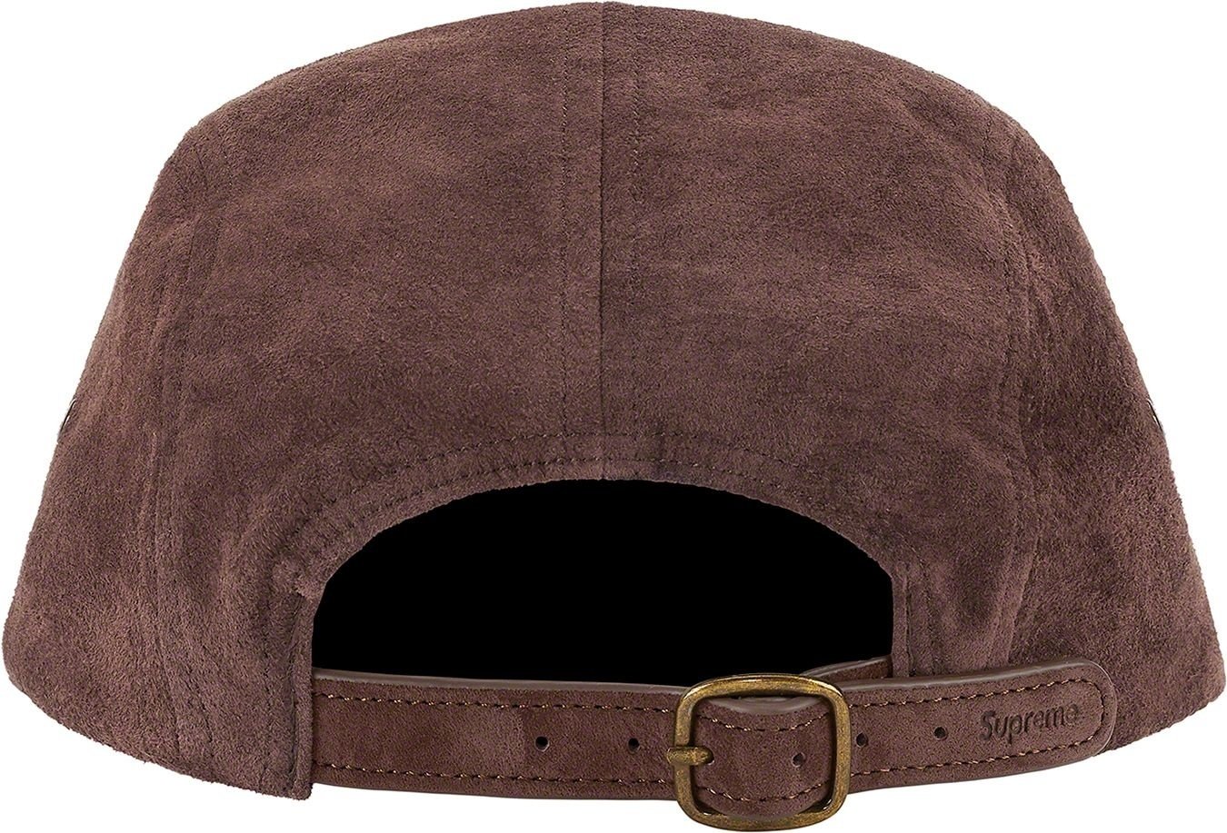 Suede Supreme camp cap with custom debossed leather strap closure.