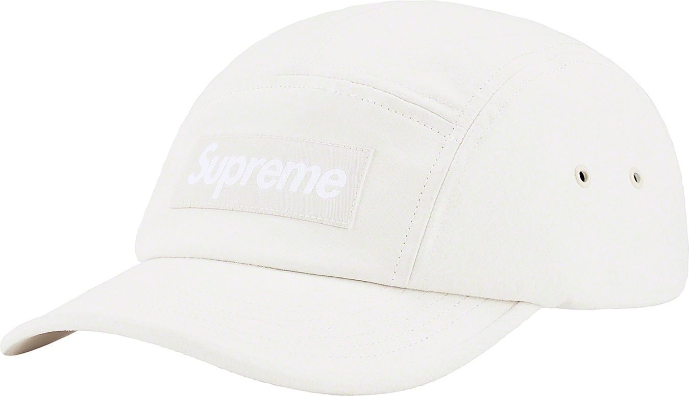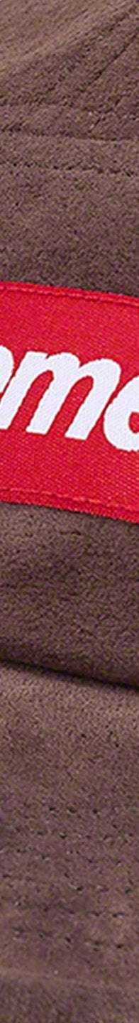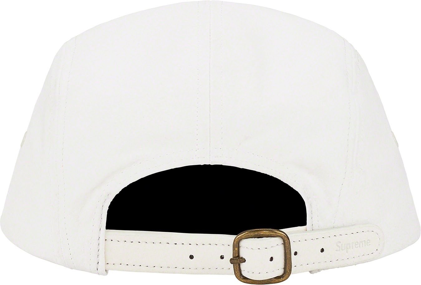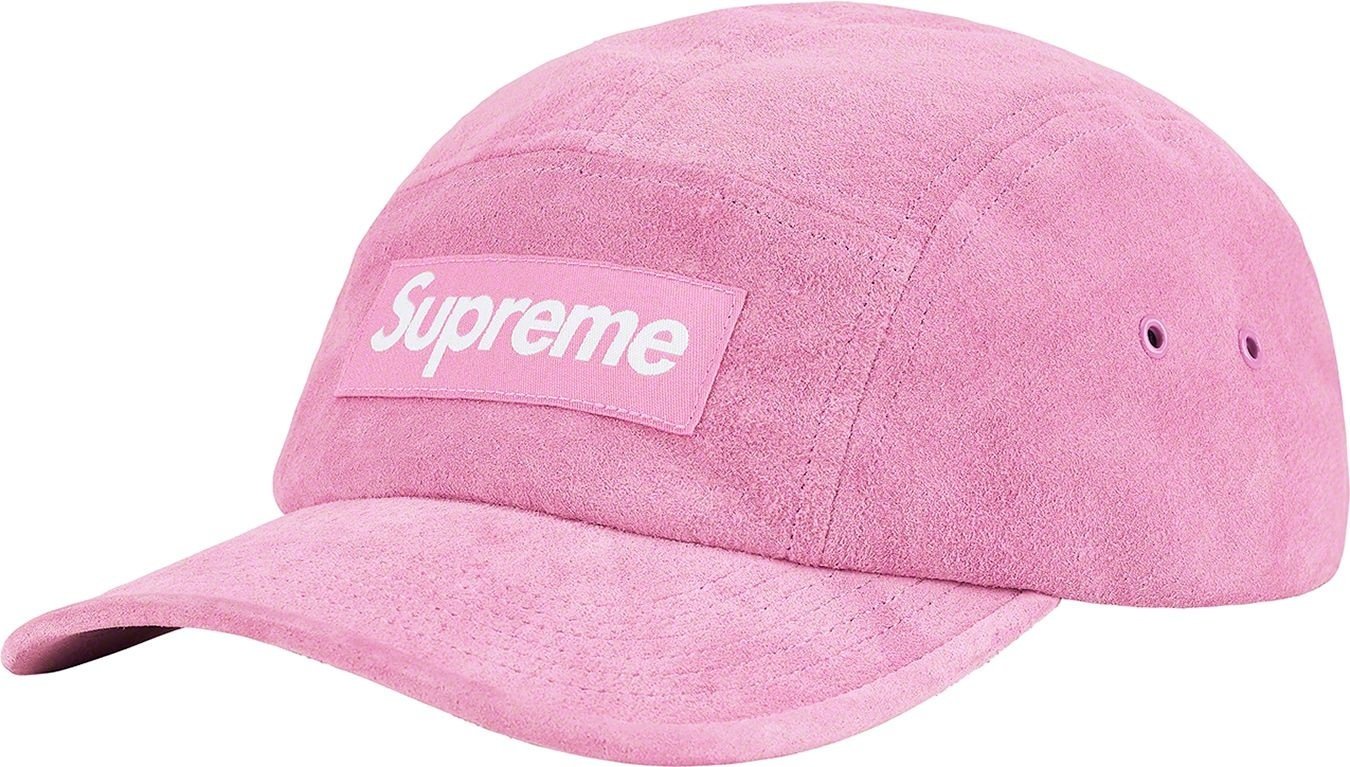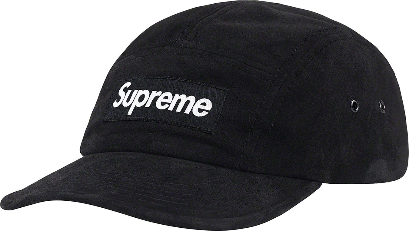 Suede Supreme camp cap with custom debossed leather strap closure.
