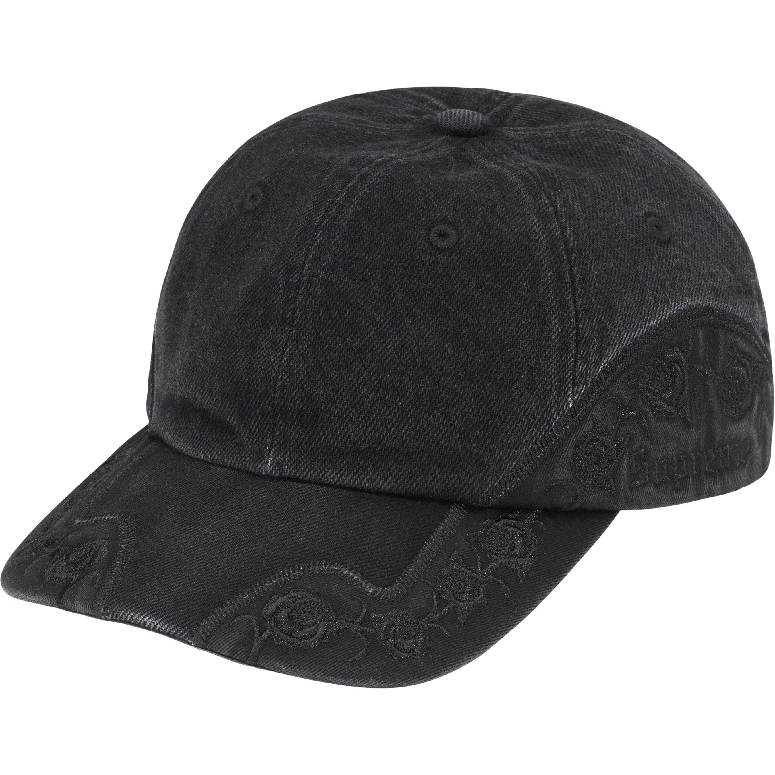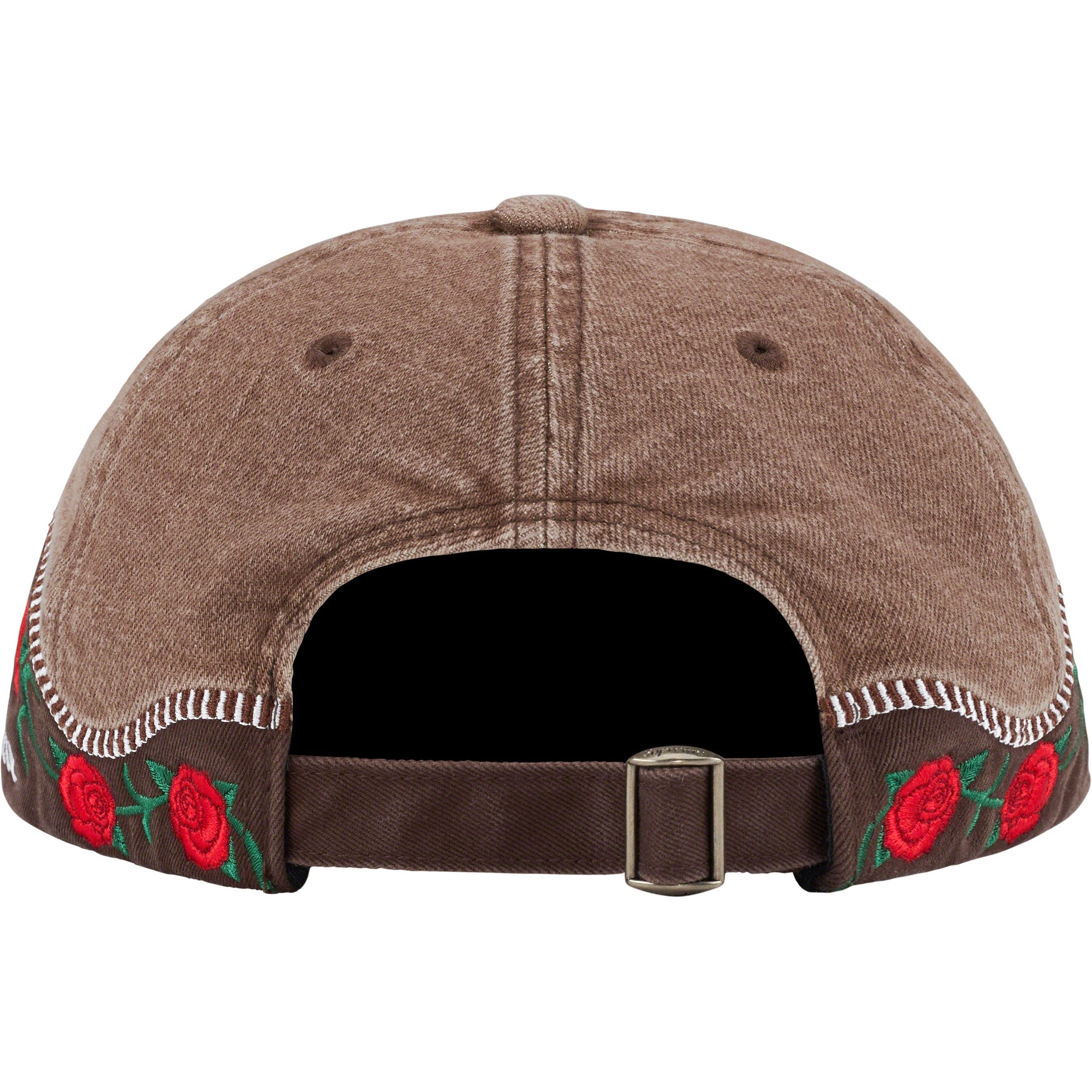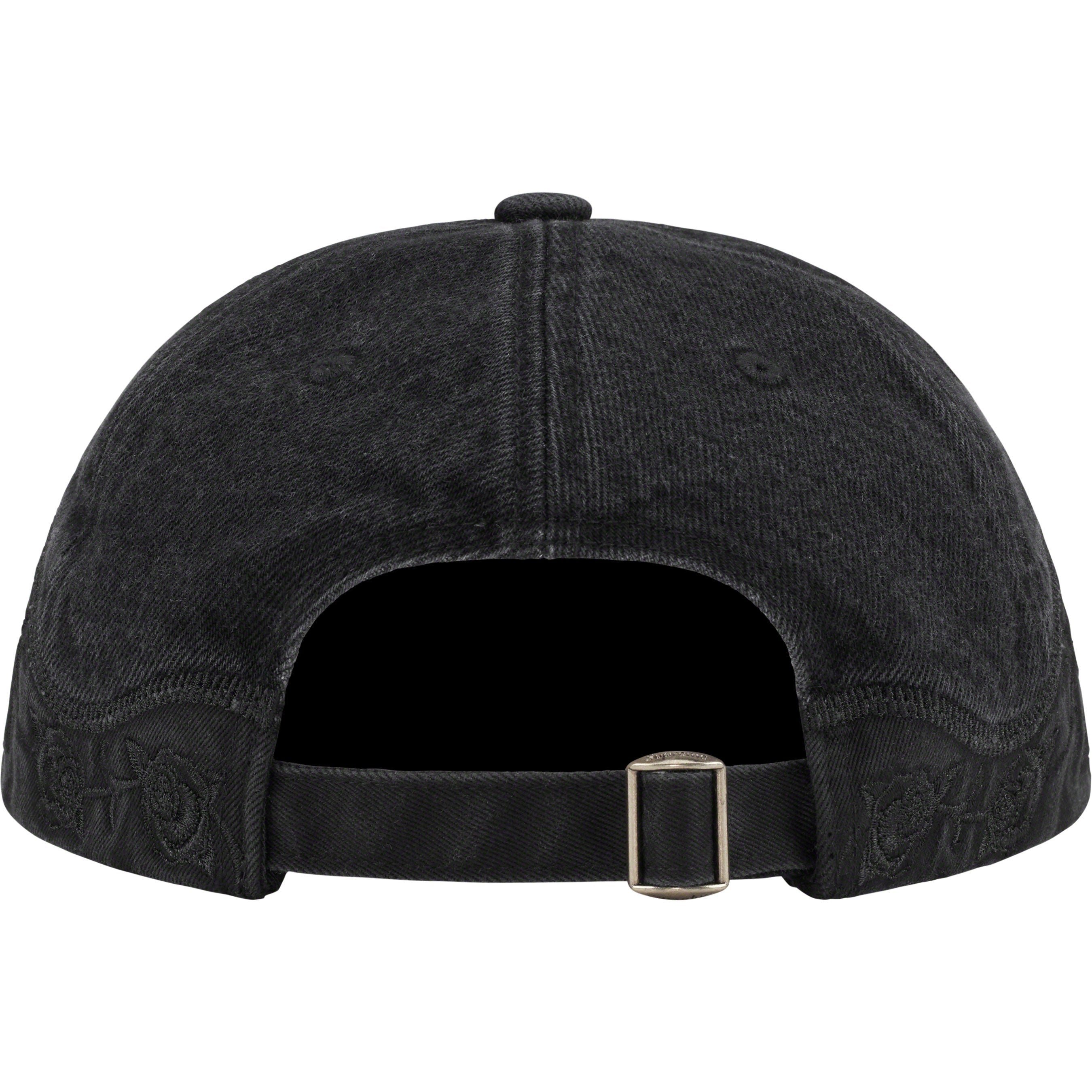 All cotton denim 6-Panel hat with self strap closure. Embroidered cotton chino twill panels on crown and visor. Embroidered logos on sides.